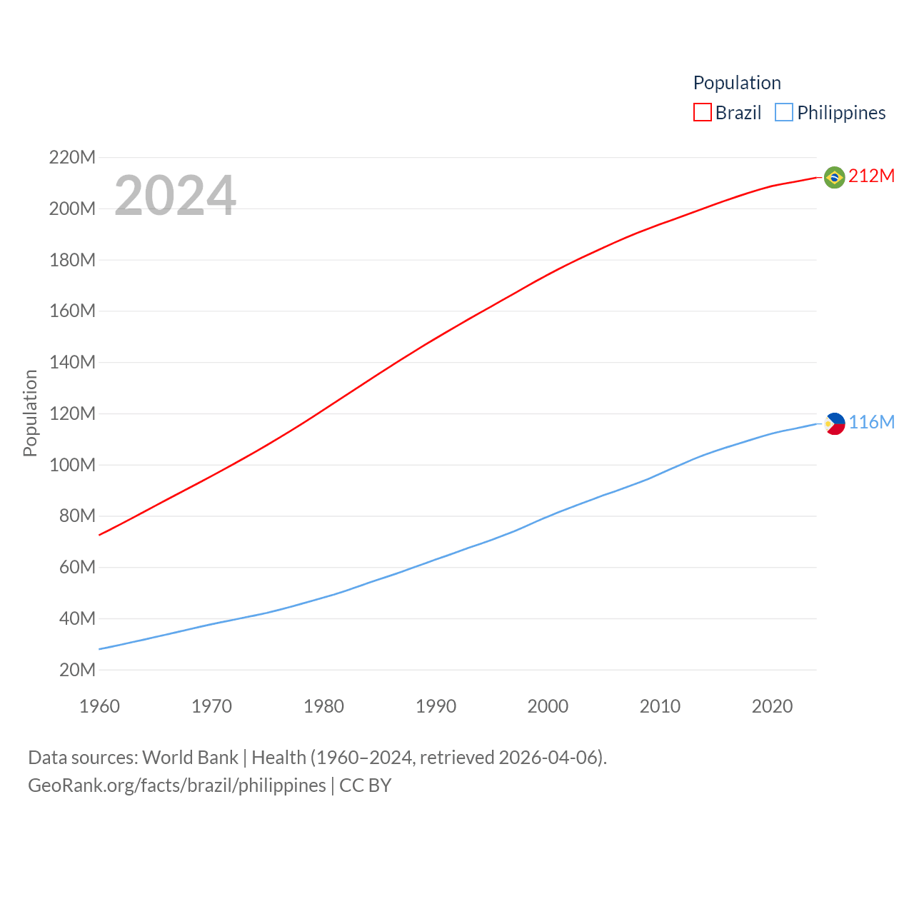 Brazil has a population of 212M (ranked 7/197), compared with 116M in The Philippines (ranked 14/197). Brazil's land area is 3,227,096 sq mi versus 115,124 sq mi for The Philippines (ranked 5th vs. 71st).