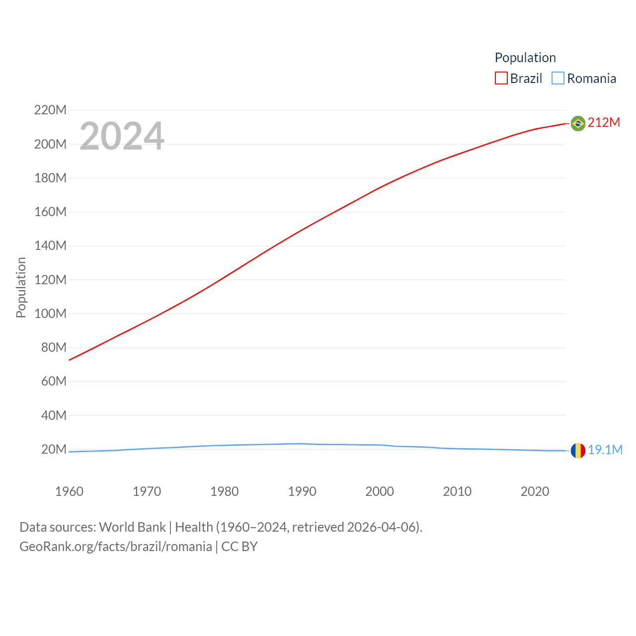 Brazil has a population of 212M (ranked 7/197), compared with 19.1M in Romania (ranked 67/197). Brazil's land area is 3,227,096 sq mi versus 88,834 sq mi for Romania (ranked 5th vs. 80th).