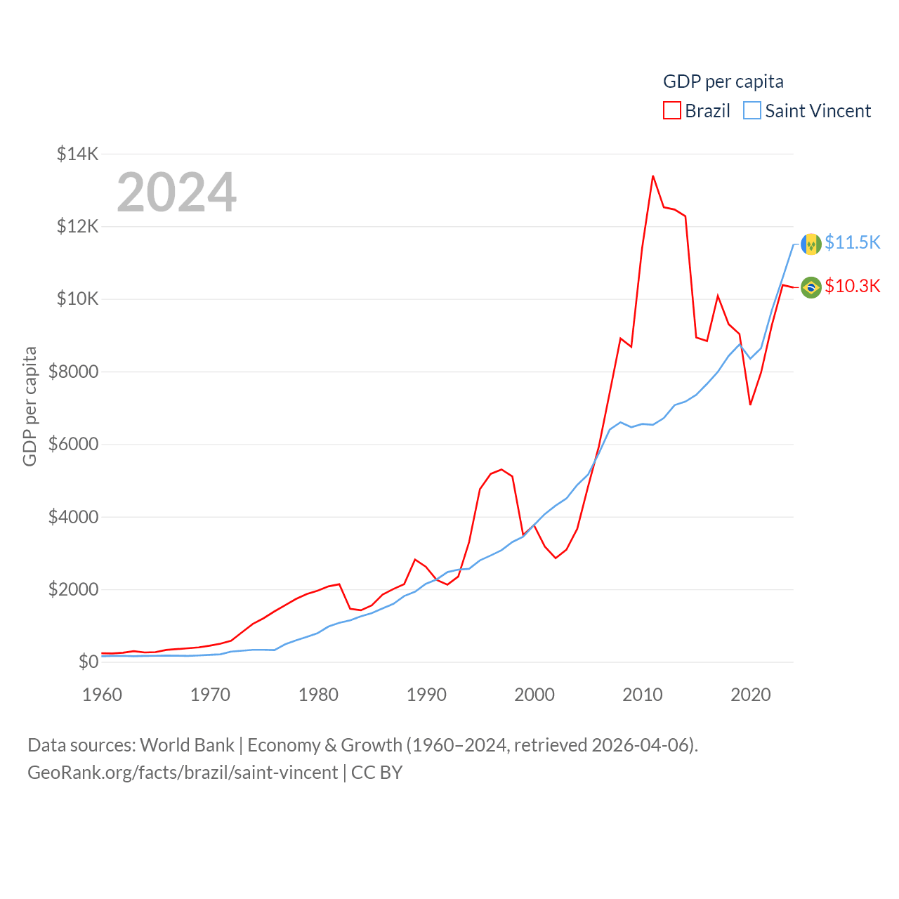 By GDP, Brazil ranks 10/197 ($2.19T) and Saint Vincent ranks 186/197 ($1.16B). By GDP per capita, Brazil ranks 85/197 ($10,311), while Saint Vincent ranks 81/197 ($11,501).
