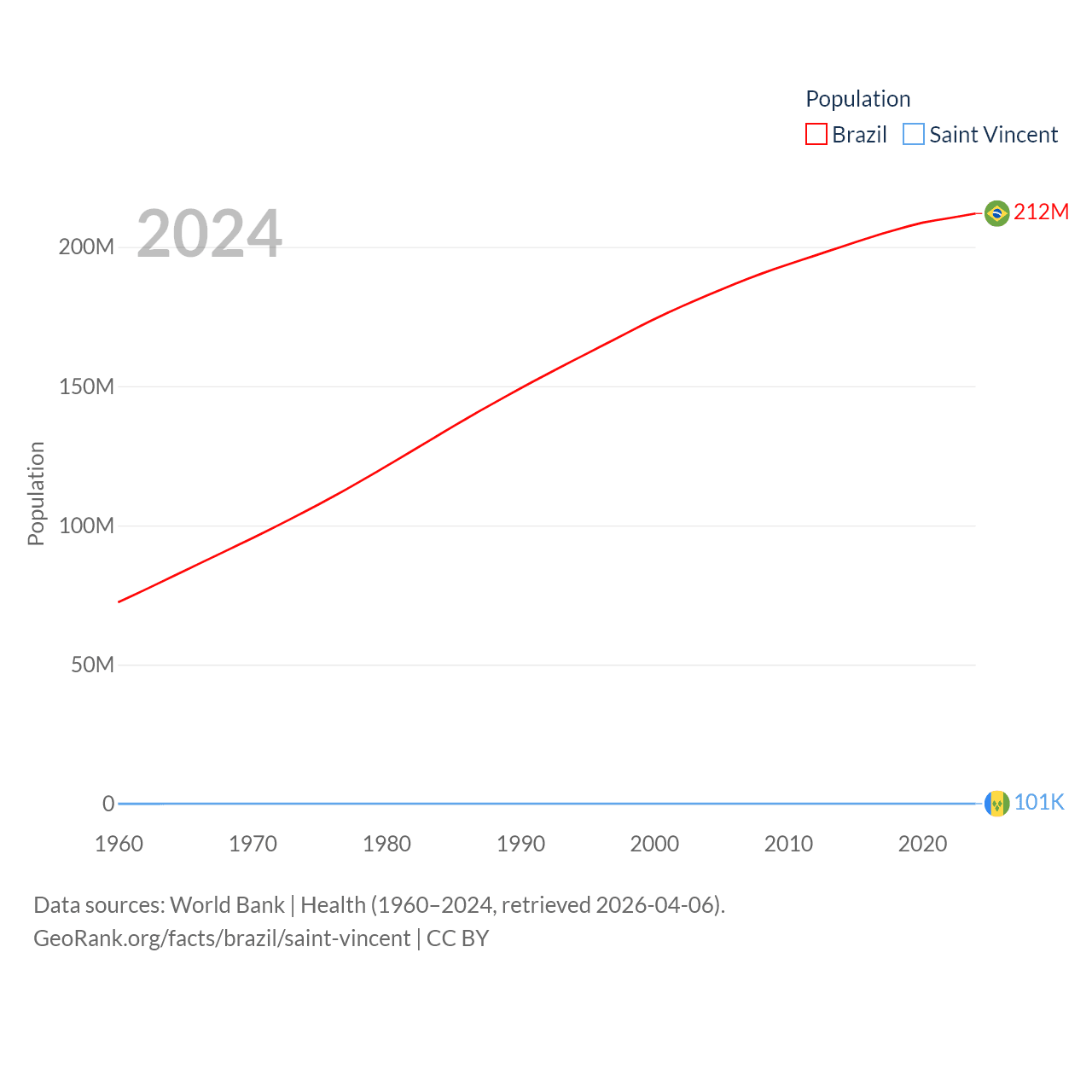Brazil has a population of 212M (ranked 7/197), compared with 101K in Saint Vincent (ranked 184/197). Brazil's land area is 3,227,096 sq mi versus 150.6 sq mi for Saint Vincent (ranked 5th vs. 185th).
