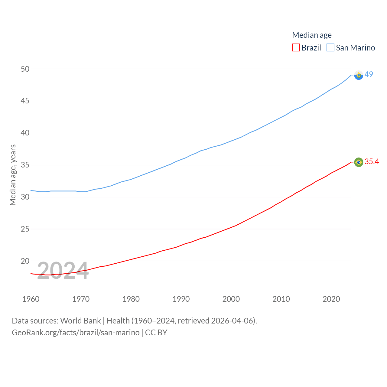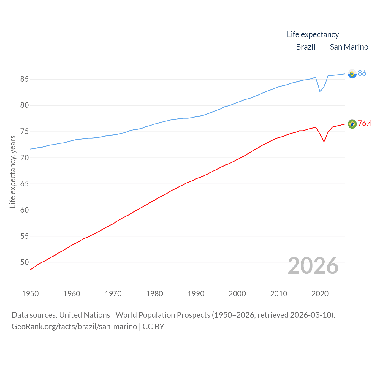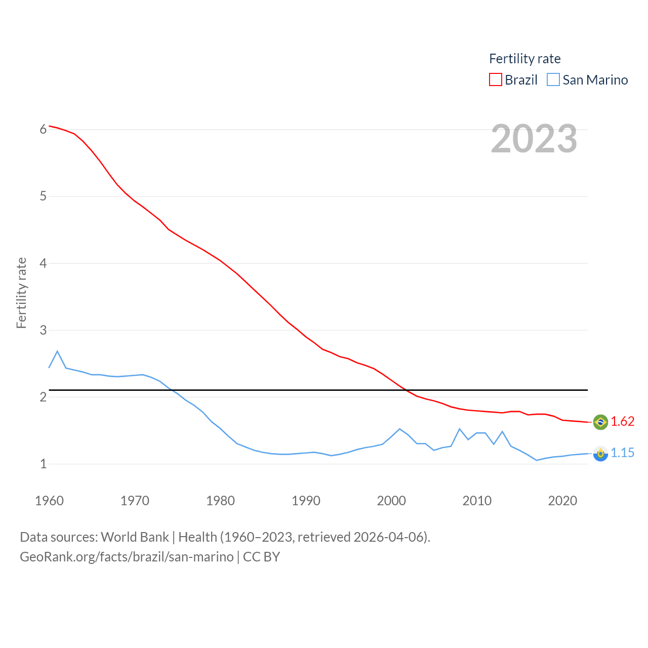 Brazil has a population of 212M (ranked 7/197), compared with 34K in San Marino (ranked 193/197). Brazil's land area is 3,227,096 sq mi versus 23.2 sq mi for San Marino (ranked 5th vs. 193rd).
