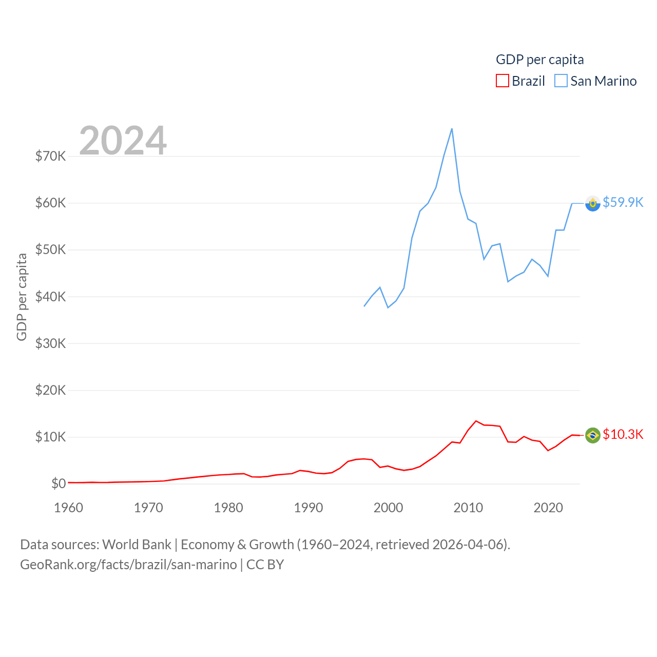 By GDP, Brazil ranks 10/197 ($2.19T) and San Marino ranks 180/197 ($2.03B). By GDP per capita, Brazil ranks 85/197 ($10,311), while San Marino ranks 15/197 ($59,880).
