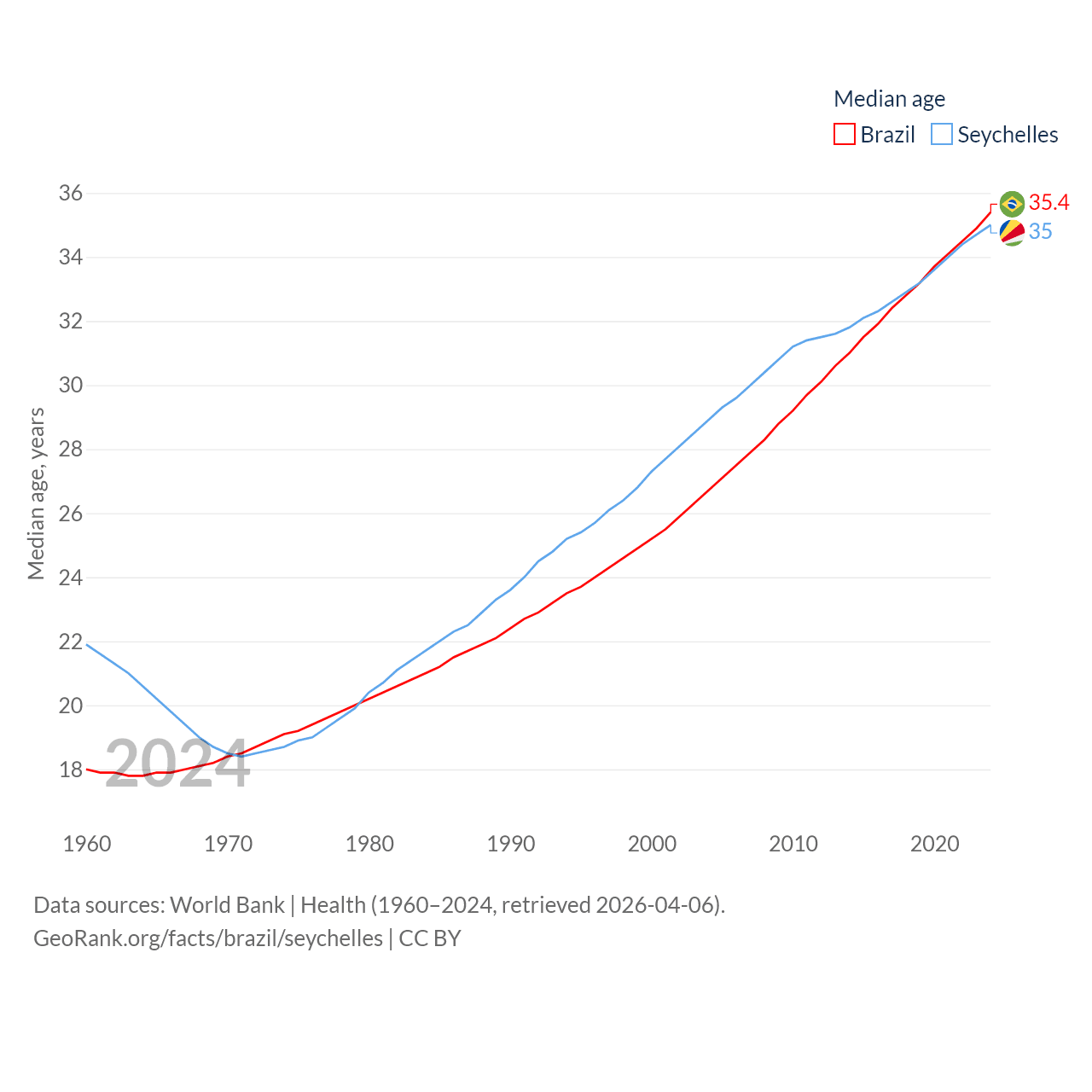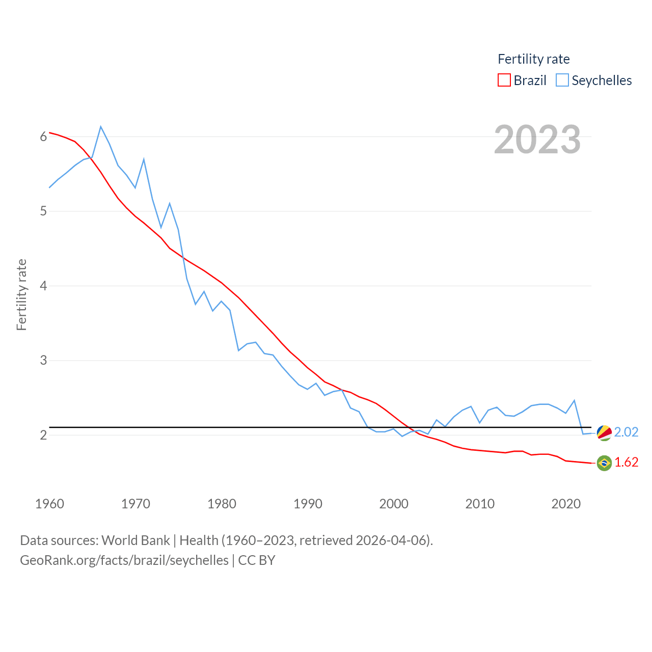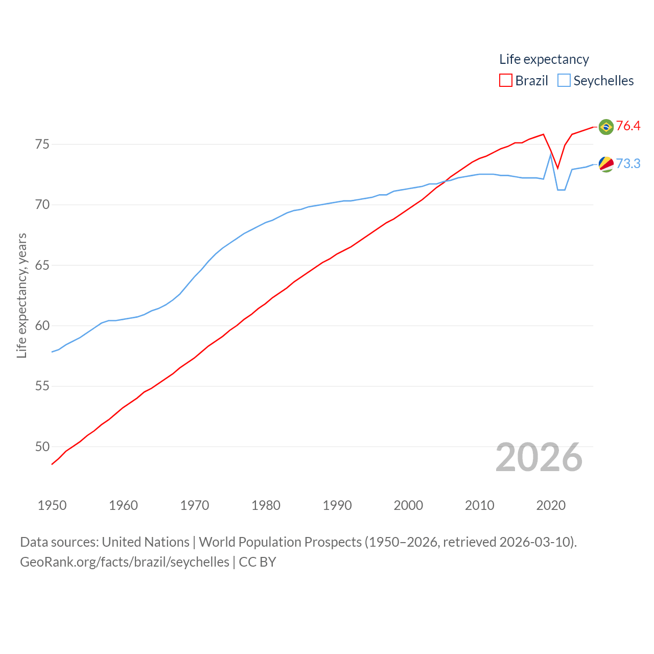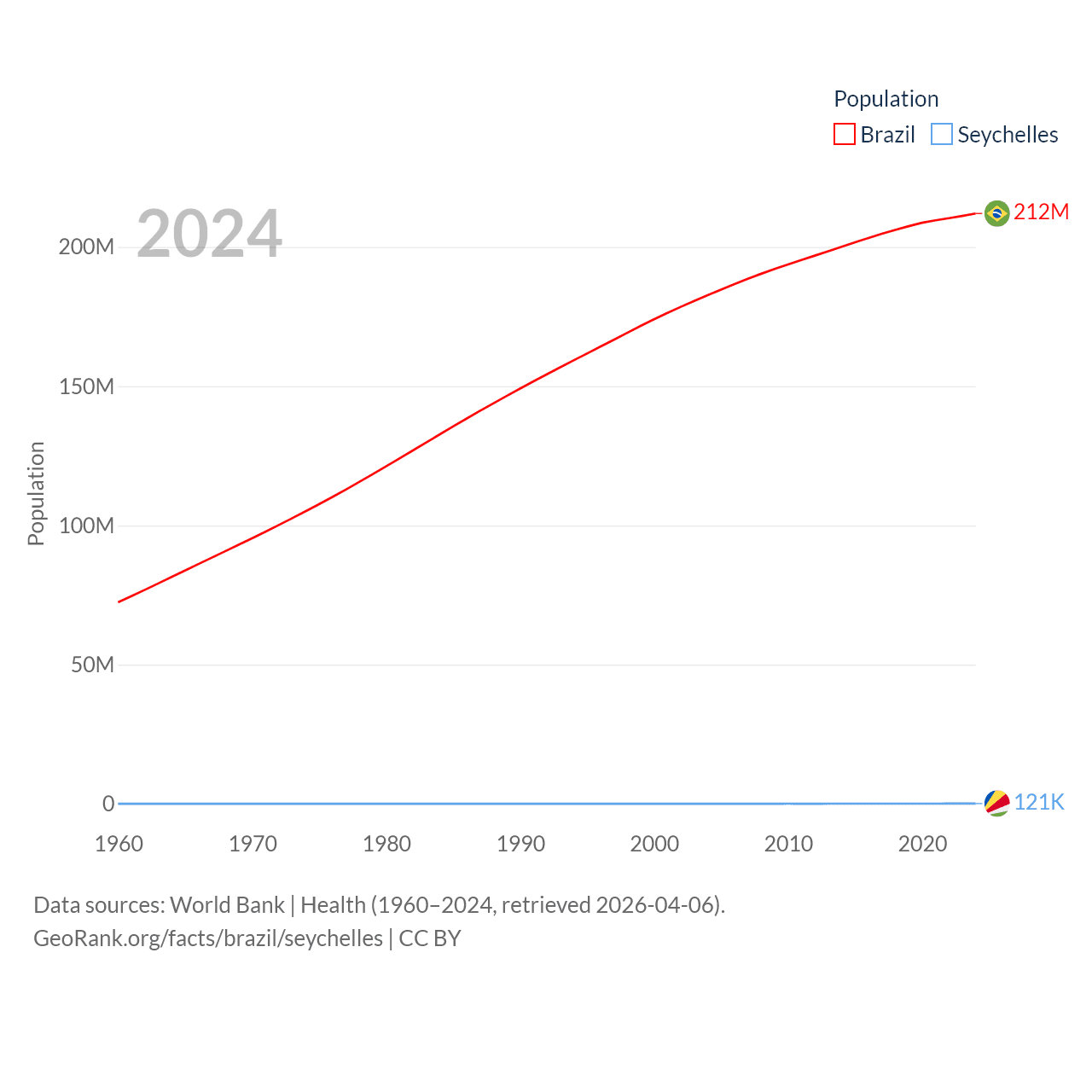 Brazil has a population of 212M (ranked 7/197), compared with 121K in The Seychelles (ranked 181/197). Brazil's land area is 3,227,096 sq mi versus 177.6 sq mi for The Seychelles (ranked 5th vs. 181st).