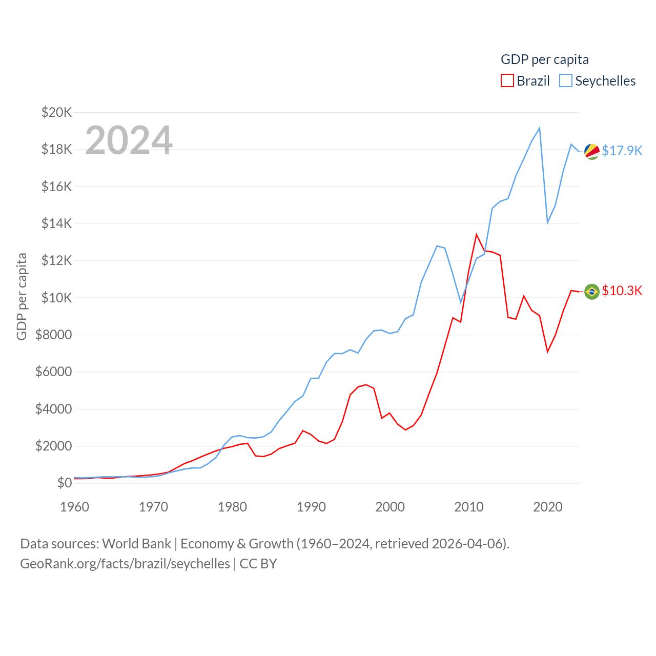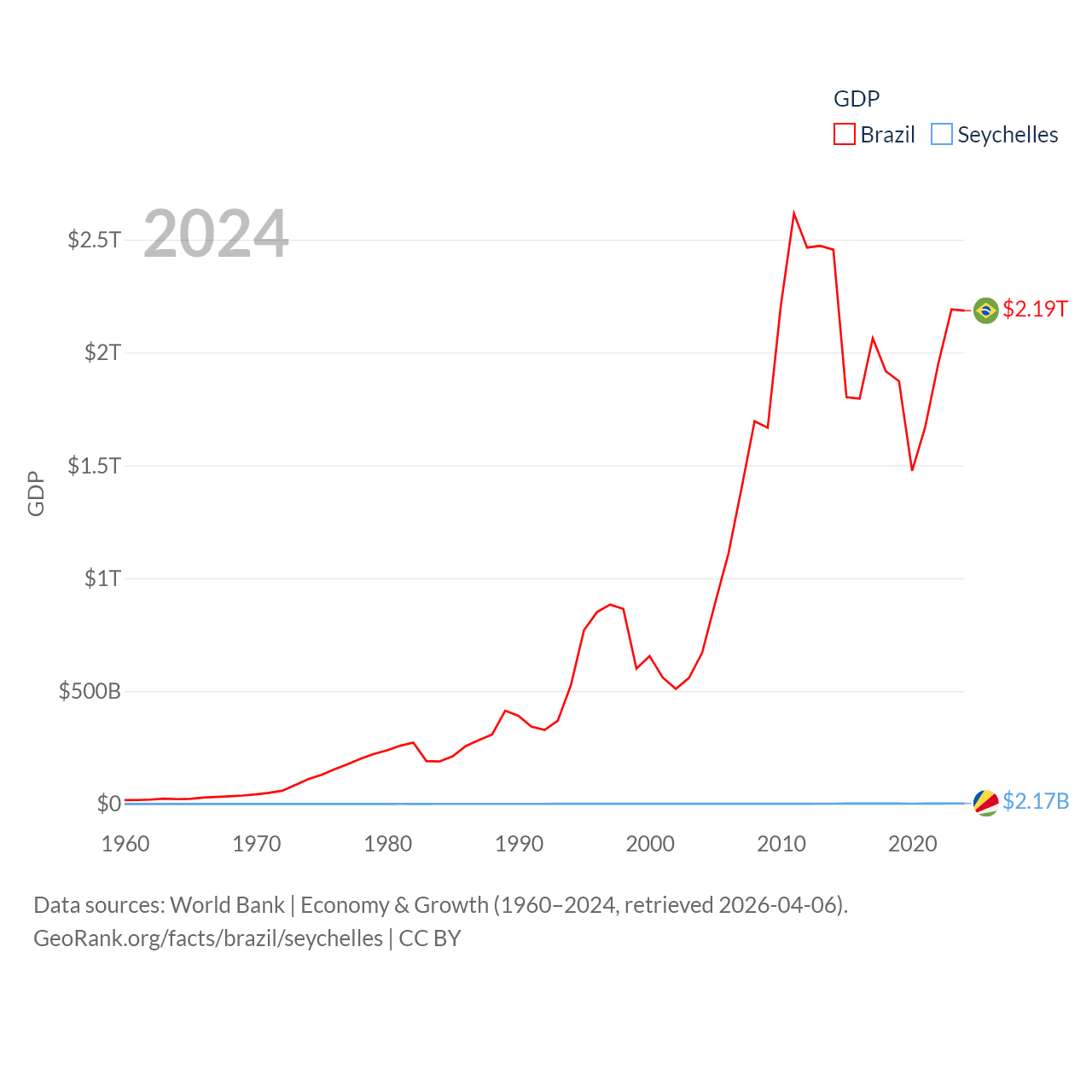 By GDP, Brazil ranks 10/197 ($2.19T) and The Seychelles ranks 178/197 ($2.17B). By GDP per capita, Brazil ranks 85/197 ($10,311), while The Seychelles ranks 63/197 ($17,859).
