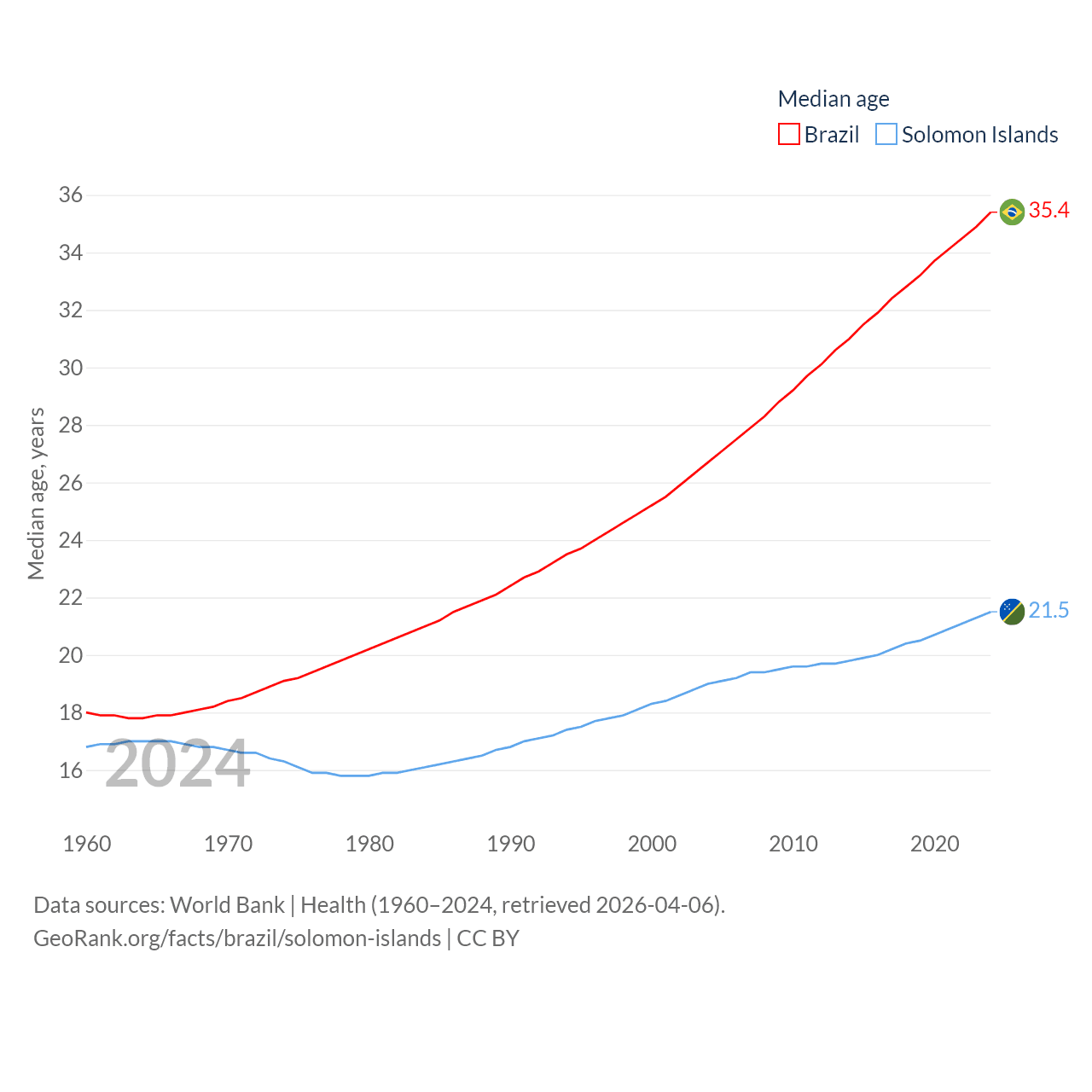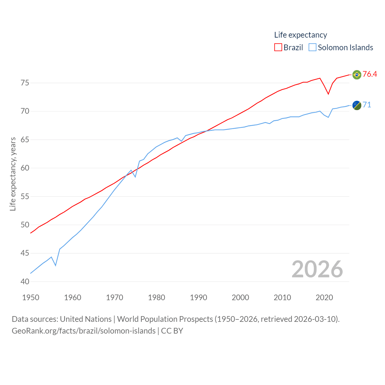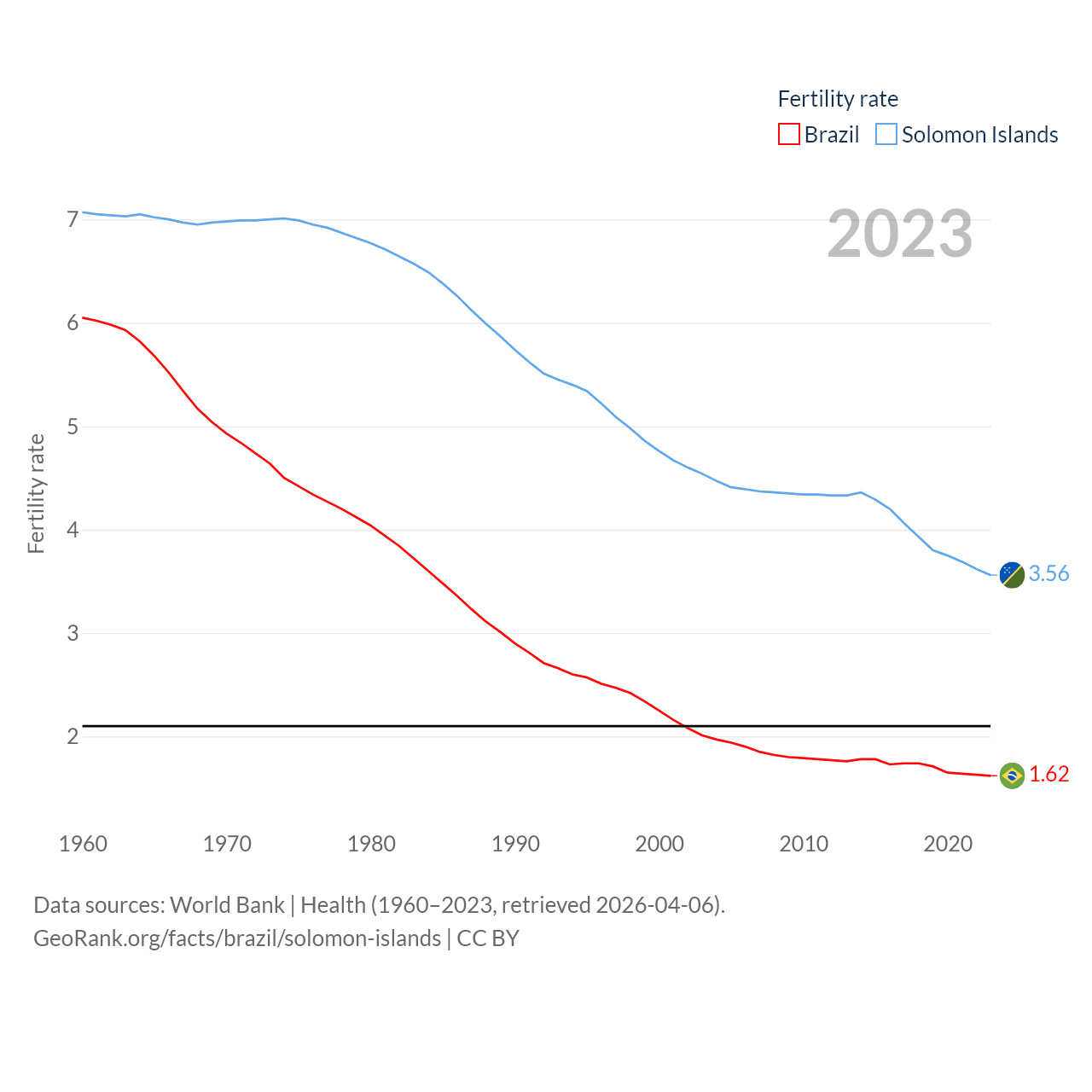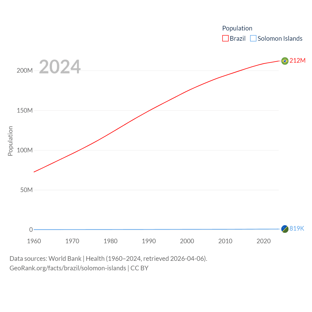 Brazil has a population of 212M (ranked 7/197), compared with 819K in The Solomon Islands (ranked 162/197). Brazil's land area is 3,227,096 sq mi versus 10,807 sq mi for The Solomon Islands (ranked 5th vs. 141st).