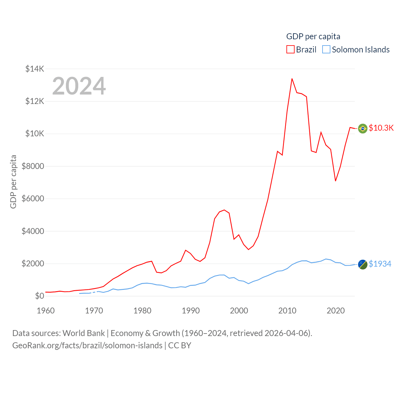 By GDP, Brazil ranks 10/197 ($2.19T) and The Solomon Islands ranks 182/197 ($1.58B). By GDP per capita, Brazil ranks 85/197 ($10,311), while The Solomon Islands ranks 157/197 ($1,934).
