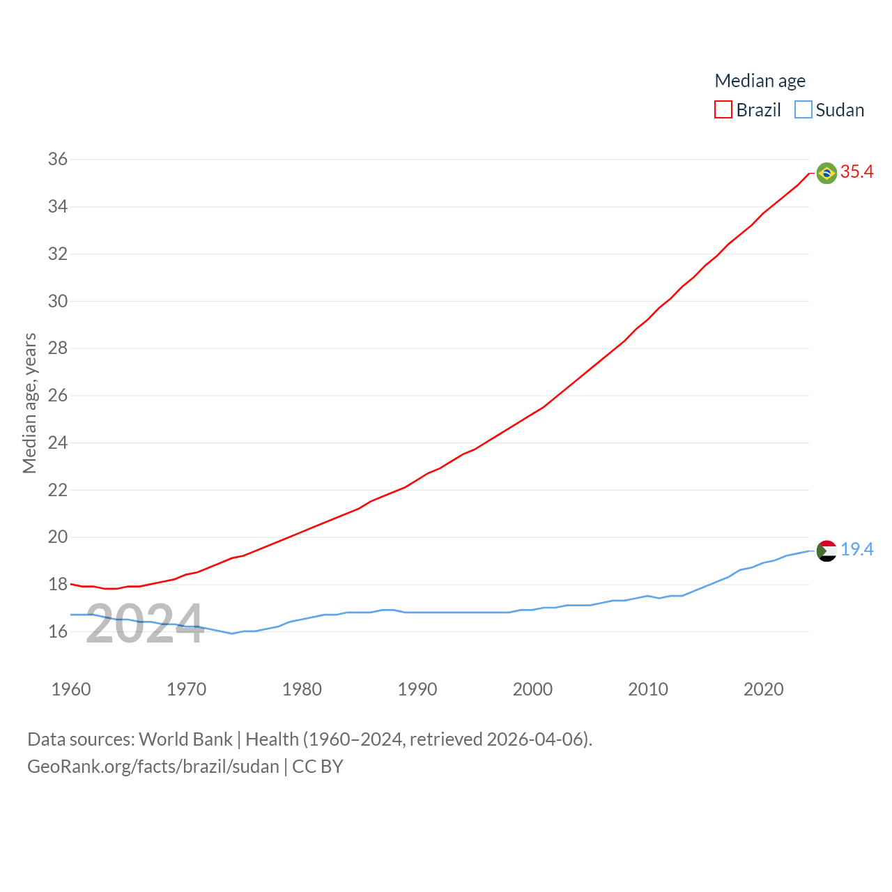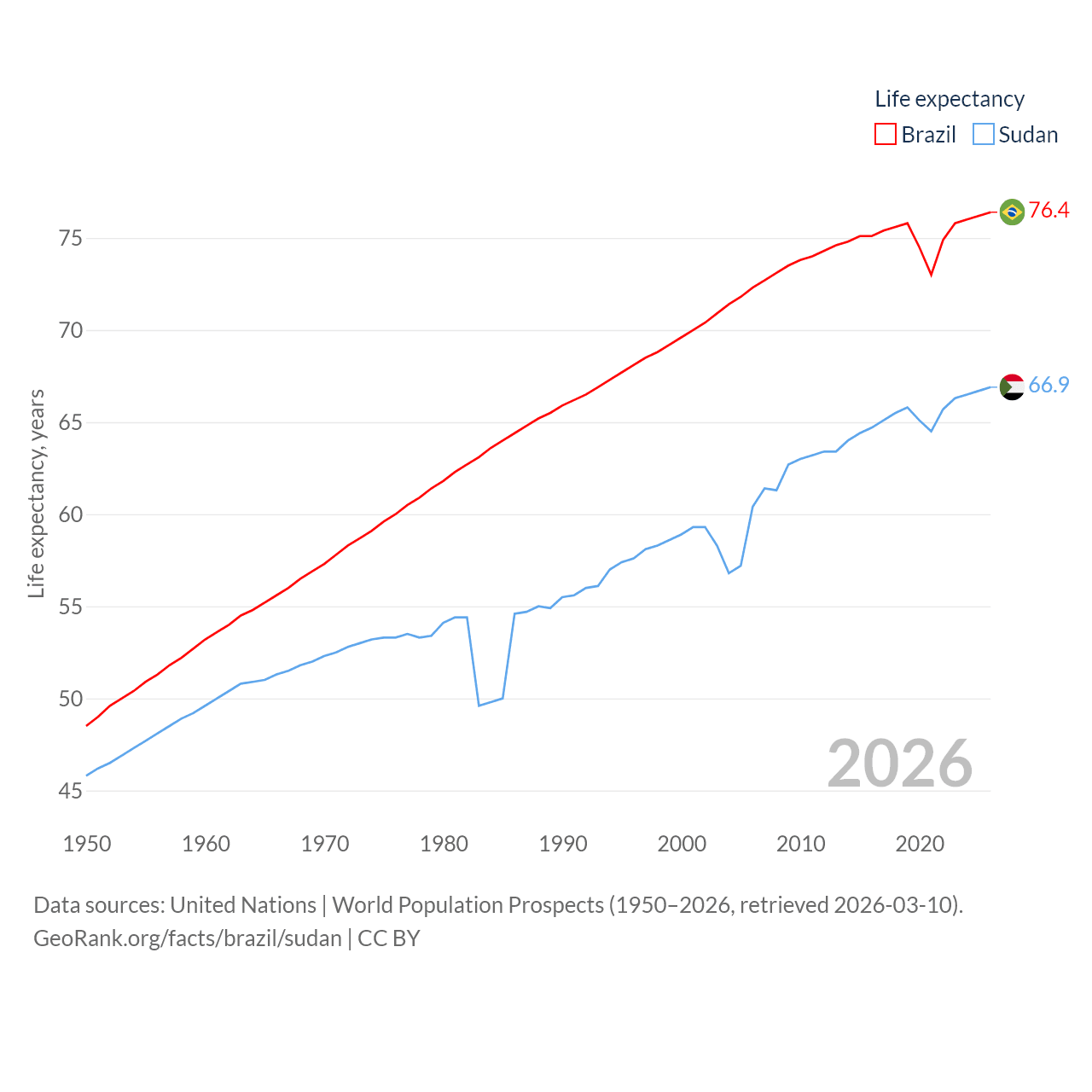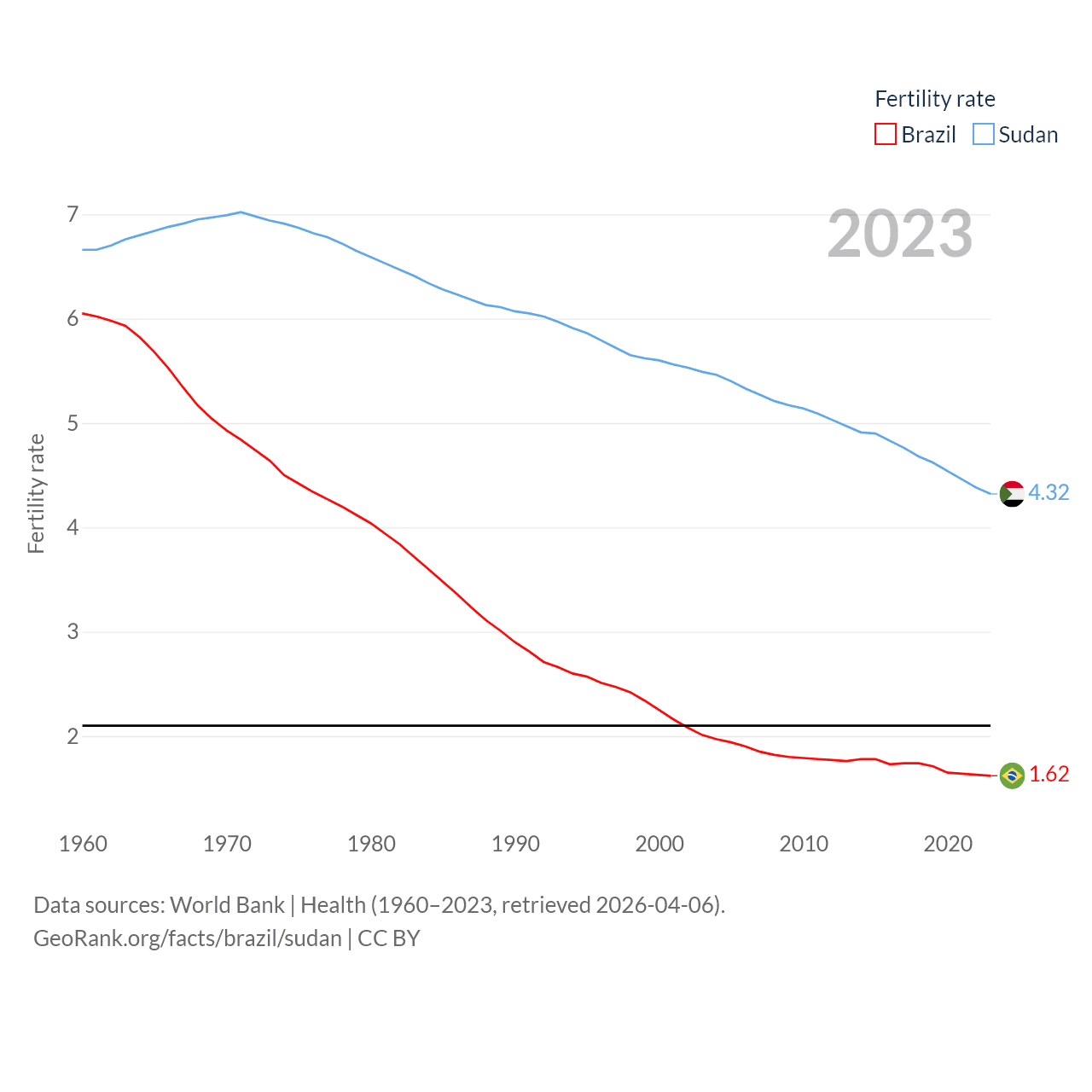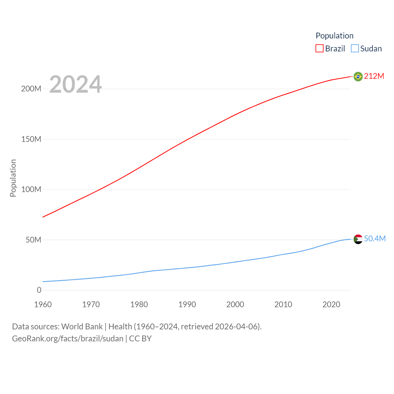 Brazil has a population of 212M (ranked 7/197), compared with 50.4M in Sudan (ranked 30/197). Brazil's land area is 3,227,096 sq mi versus 721,239 sq mi for Sudan (ranked 5th vs. 15th).