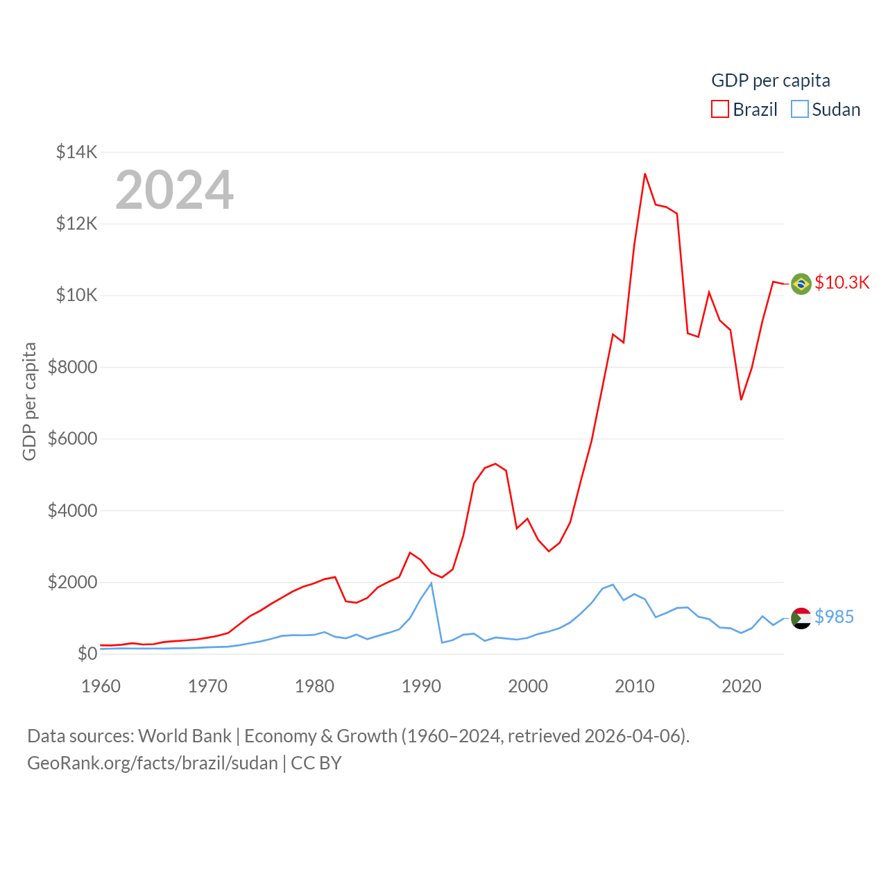 By GDP, Brazil ranks 10/197 ($2.19T) and Sudan ranks 94/197 ($49.7B). By GDP per capita, Brazil ranks 85/197 ($10,311), while Sudan ranks 179/197 ($985).