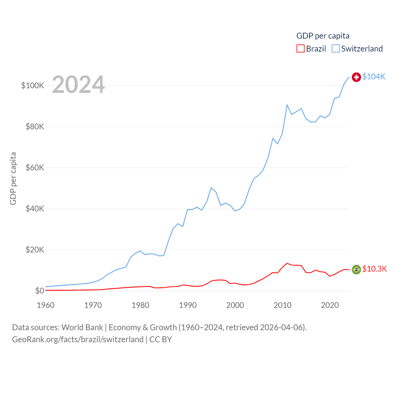 By GDP, Brazil ranks 10/197 ($2.19T) and Switzerland ranks 20/197 ($937B). By GDP per capita, Brazil ranks 85/197 ($10,311), while Switzerland ranks 5/197 ($103,998).