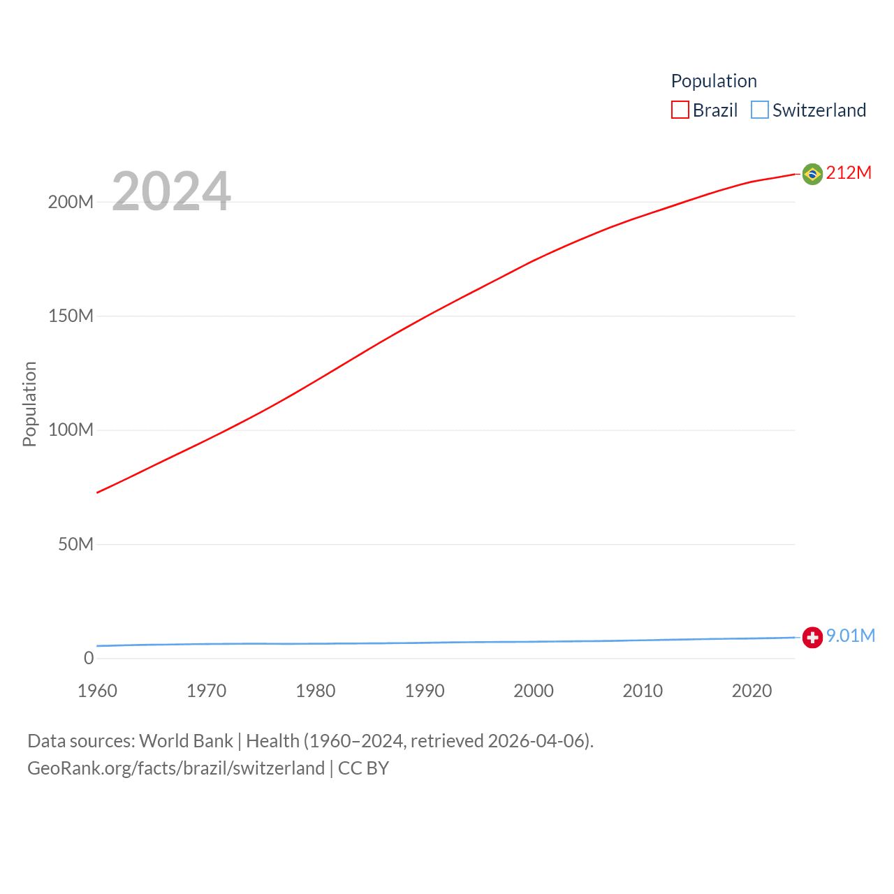 Brazil has a population of 212M (ranked 7/197), compared with 9.01M in Switzerland (ranked 101/197). Brazil's land area is 3,227,096 sq mi versus 15,255 sq mi for Switzerland (ranked 5th vs. 131st).