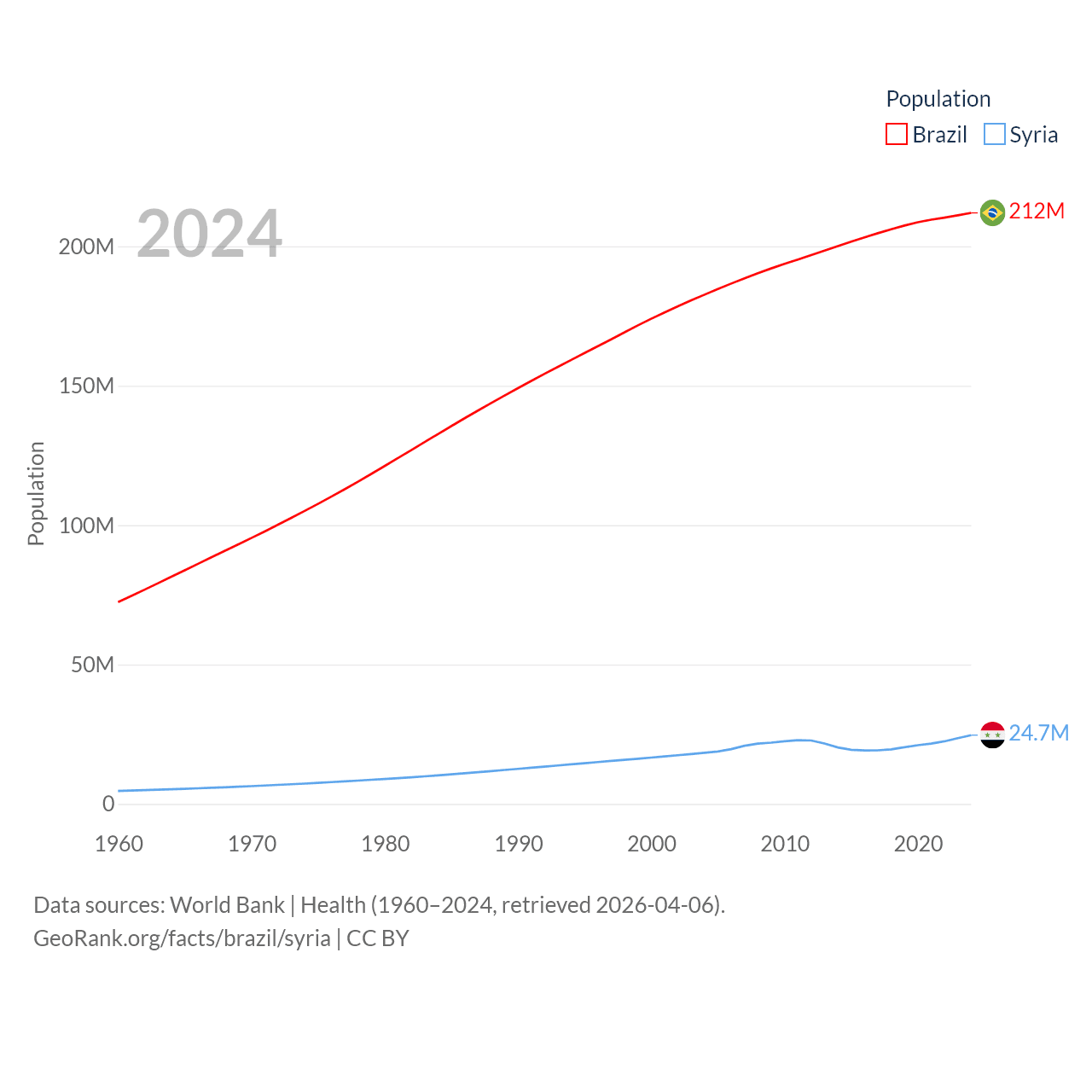 Brazil has a population of 212M (ranked 7/197), compared with 24.7M in Syria (ranked 57/197). Brazil's land area is 3,227,096 sq mi versus 70,900 sq mi for Syria (ranked 5th vs. 87th).