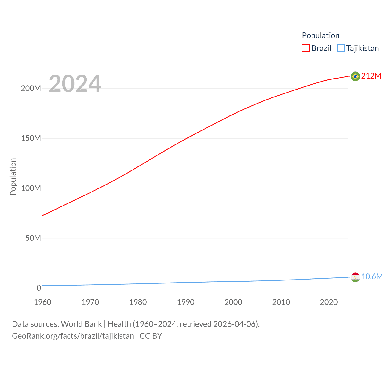 Brazil has a population of 212M (ranked 7/197), compared with 10.6M in Tajikistan (ranked 91/197). Brazil's land area is 3,227,096 sq mi versus 53,587 sq mi for Tajikistan (ranked 5th vs. 93rd).