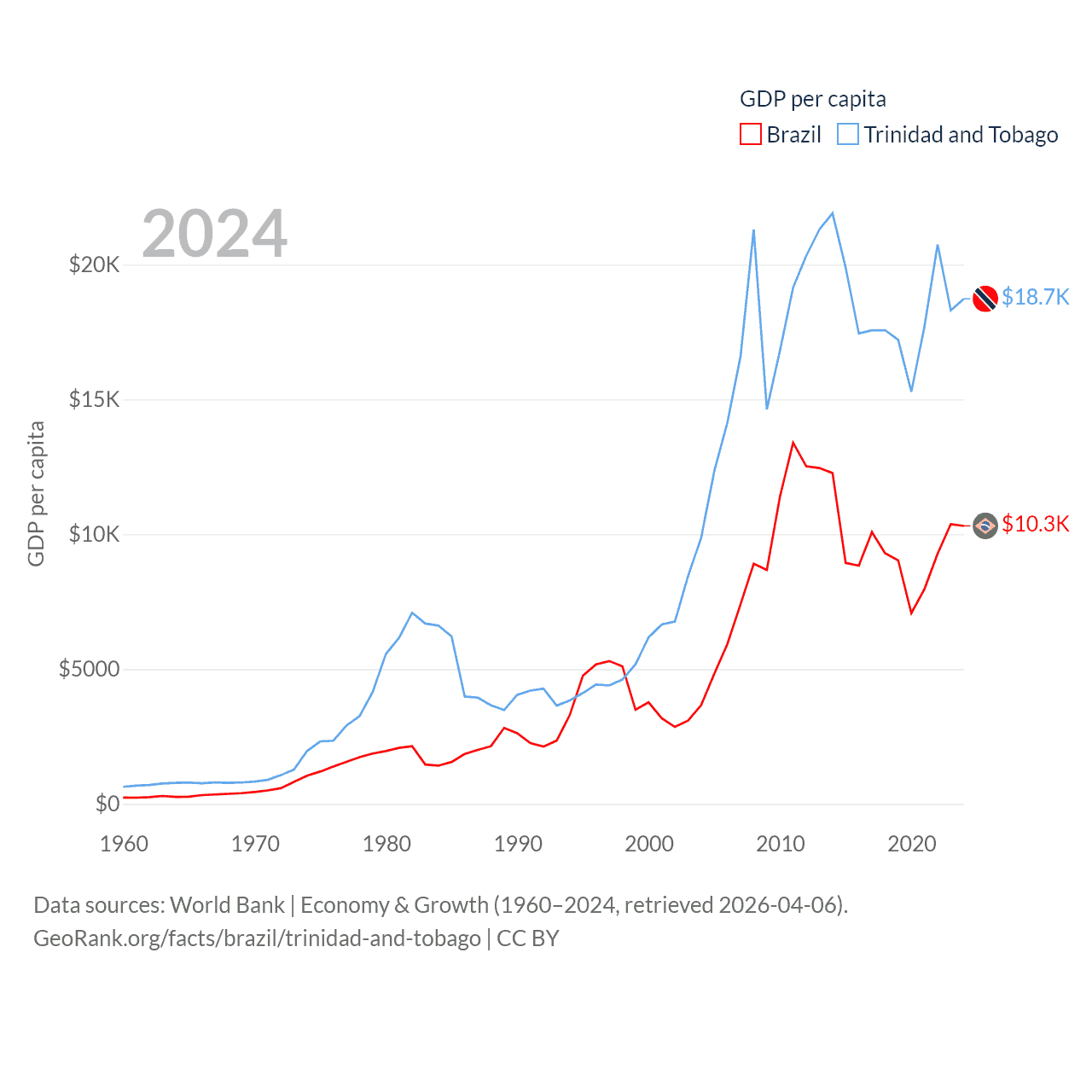 By GDP, Brazil ranks 10/197 ($2.19T) and Trinidad and Tobago ranks 115/197 ($25.6B). By GDP per capita, Brazil ranks 85/197 ($10,311), while Trinidad and Tobago ranks 61/197 ($18,733).