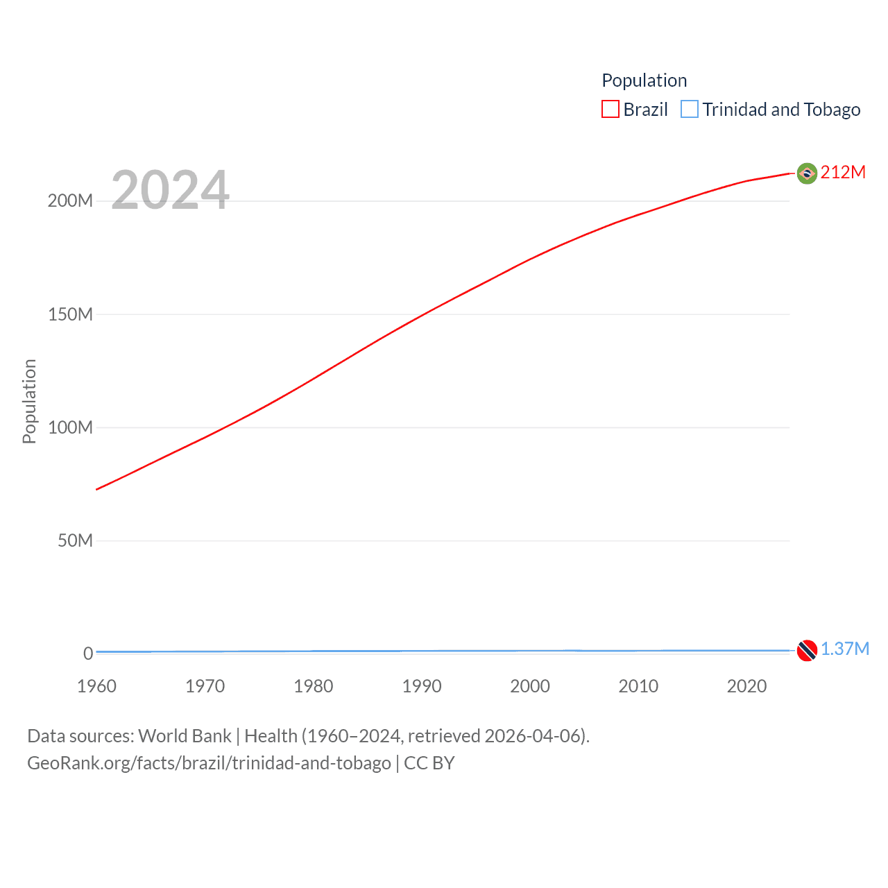 Brazil has a population of 212M (ranked 7/197), compared with 1.37M in Trinidad and Tobago (ranked 154/197). Brazil's land area is 3,227,096 sq mi versus 1,981 sq mi for Trinidad and Tobago (ranked 5th vs. 166th).