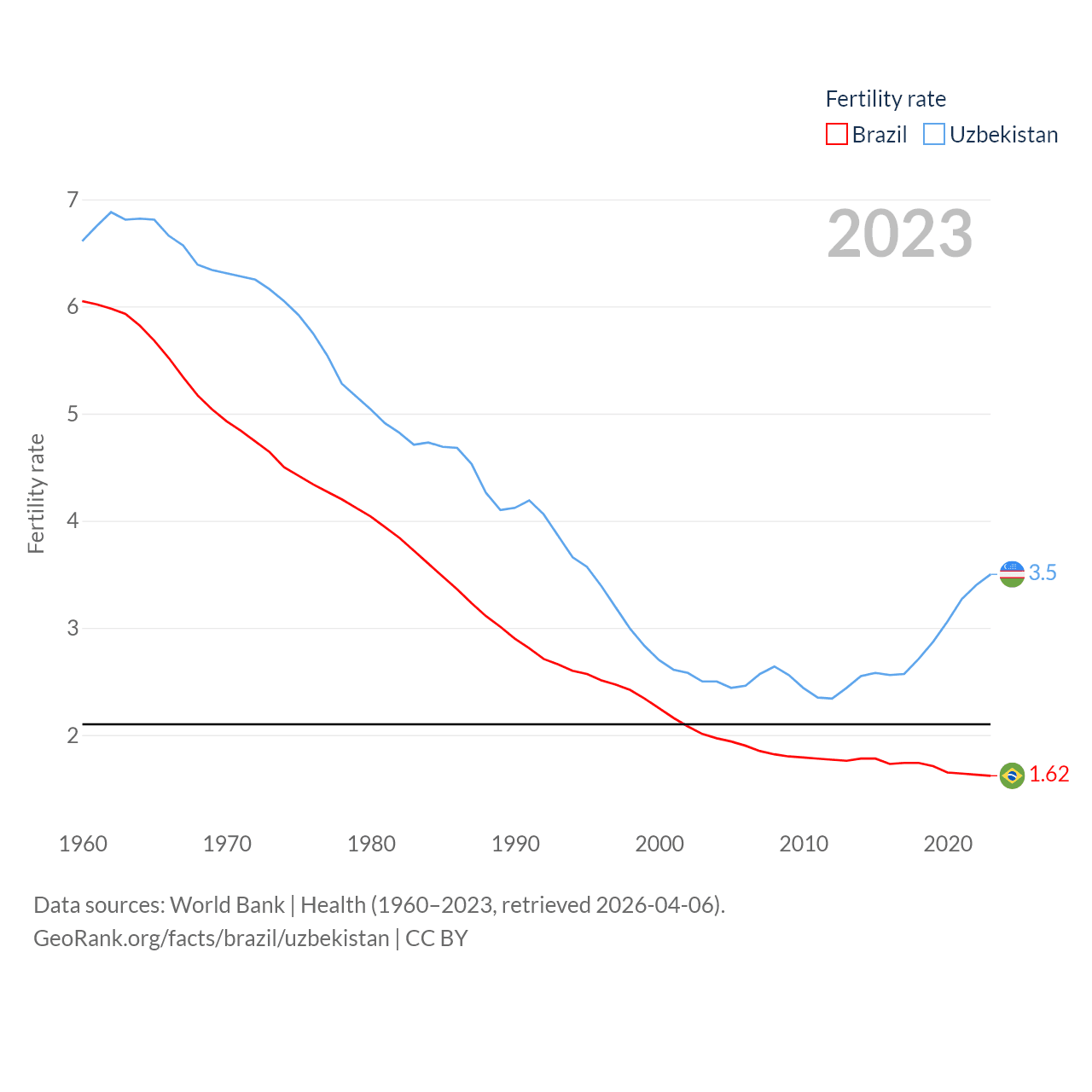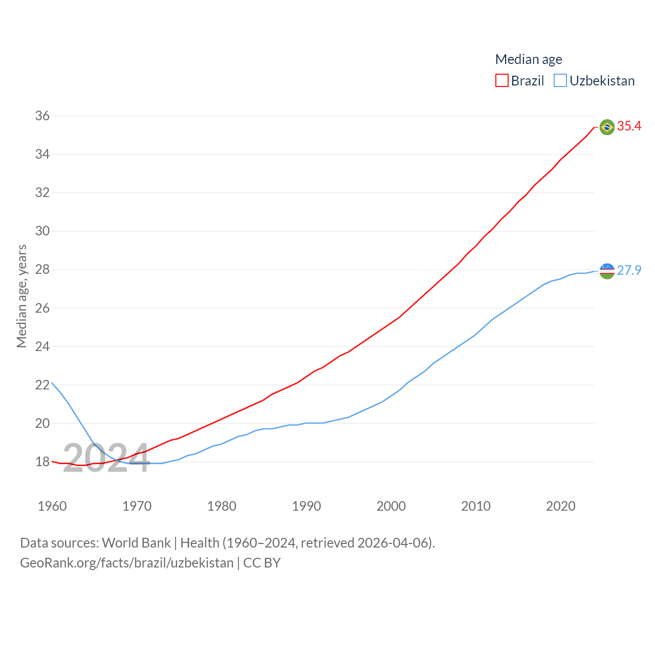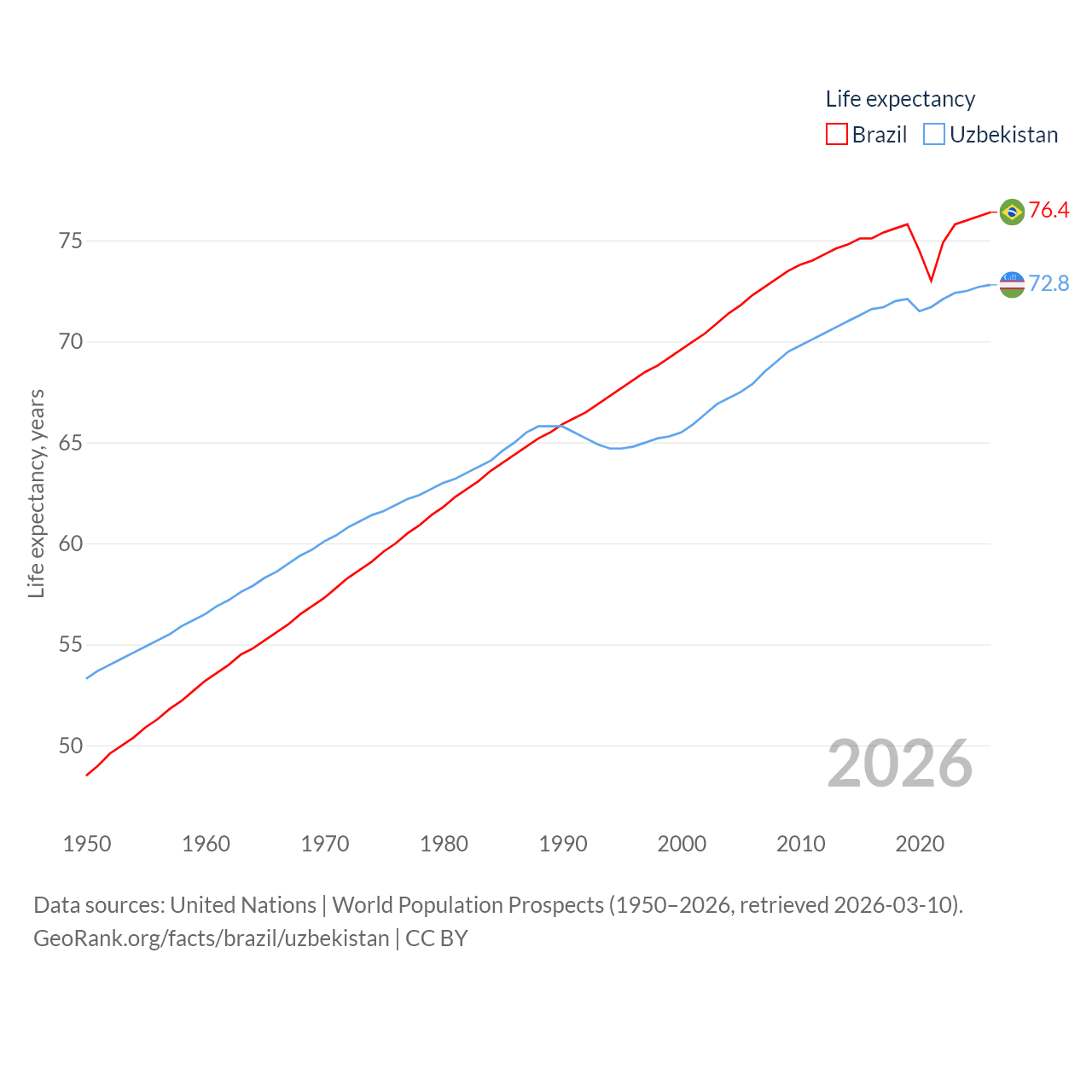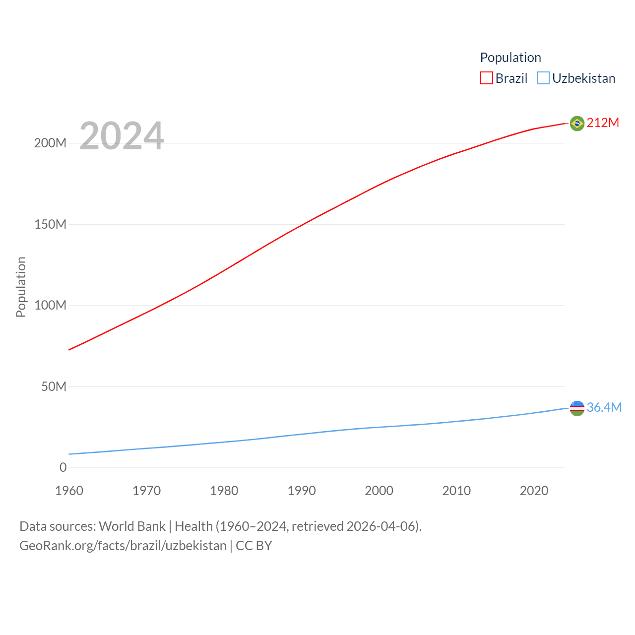 Brazil has a population of 212M (ranked 7/197), compared with 36.4M in Uzbekistan (ranked 43/197). Brazil's land area is 3,227,096 sq mi versus 170,136 sq mi for Uzbekistan (ranked 5th vs. 56th).