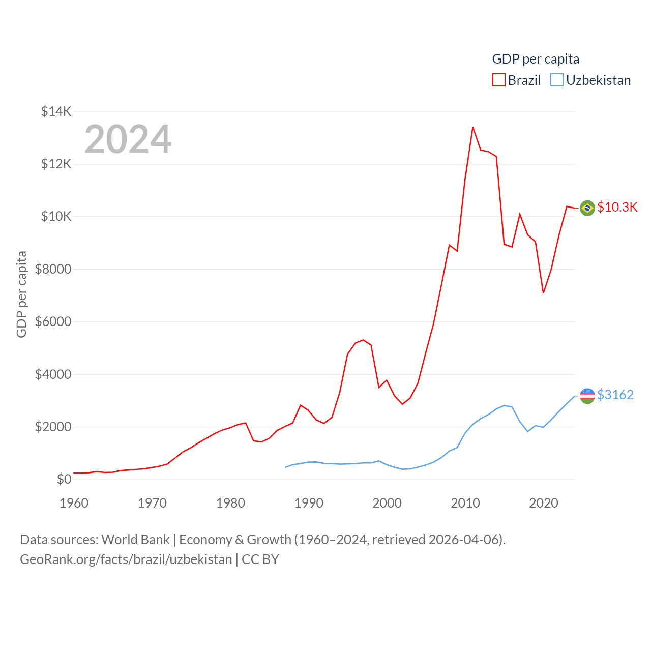 By GDP, Brazil ranks 10/197 ($2.19T) and Uzbekistan ranks 66/197 ($115B). By GDP per capita, Brazil ranks 85/197 ($10,311), while Uzbekistan ranks 139/197 ($3,162).