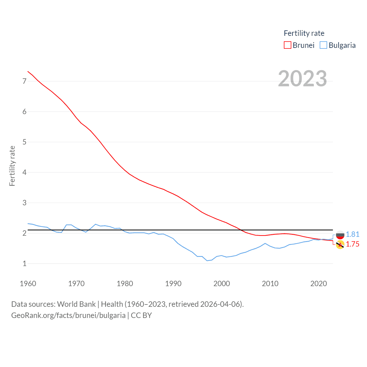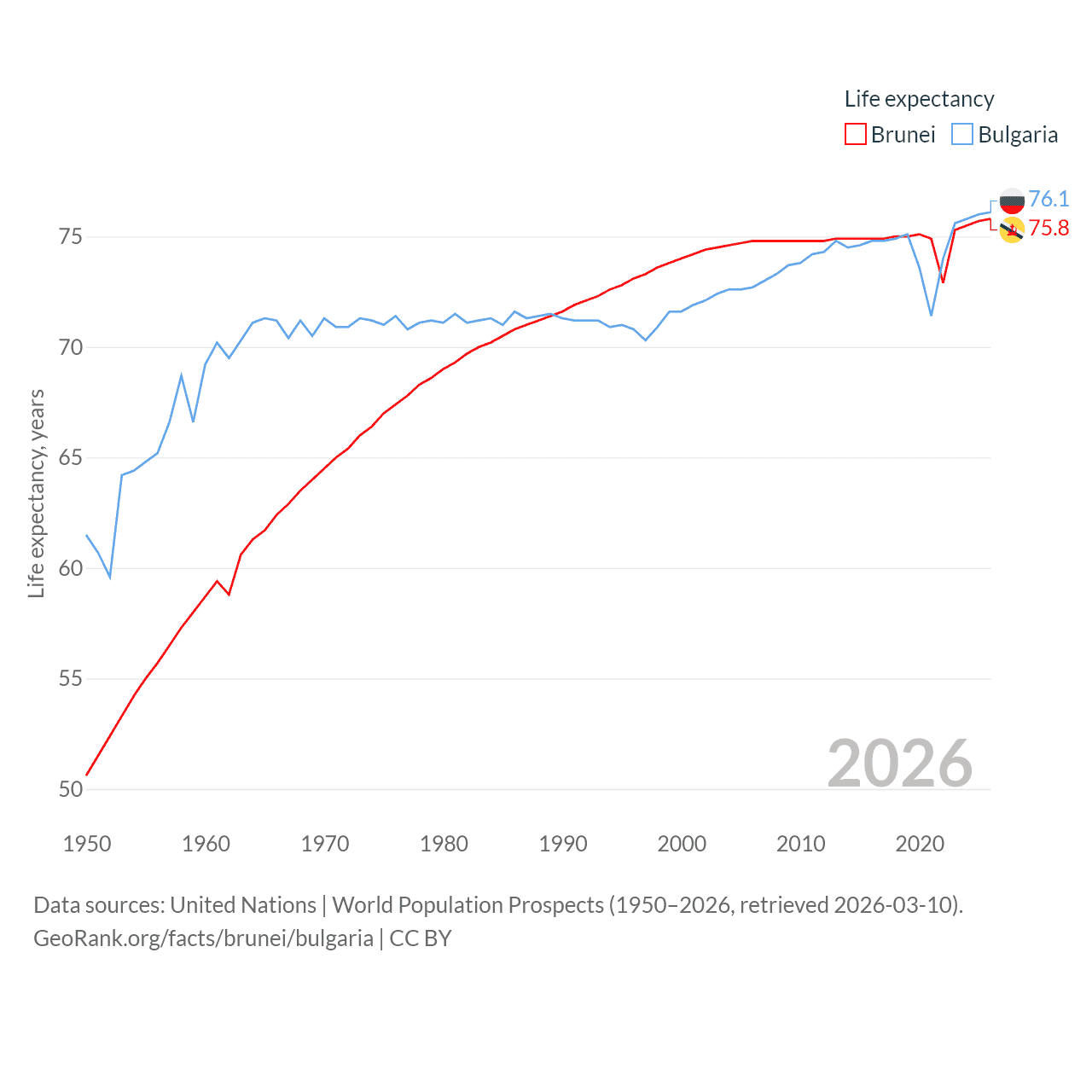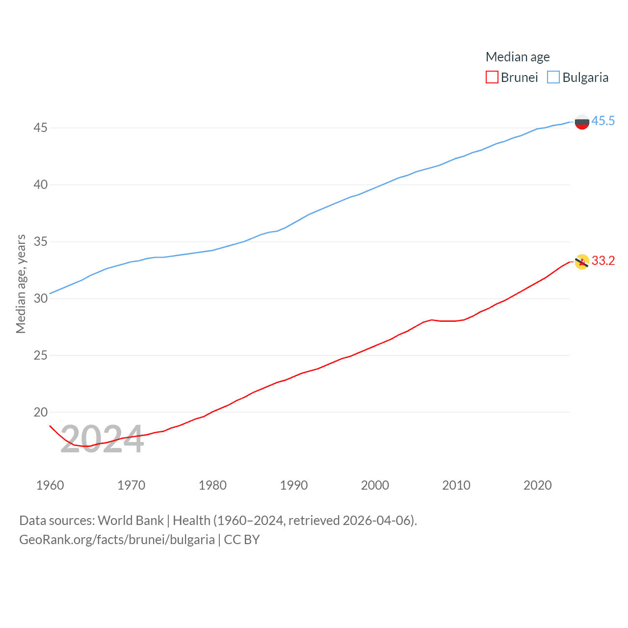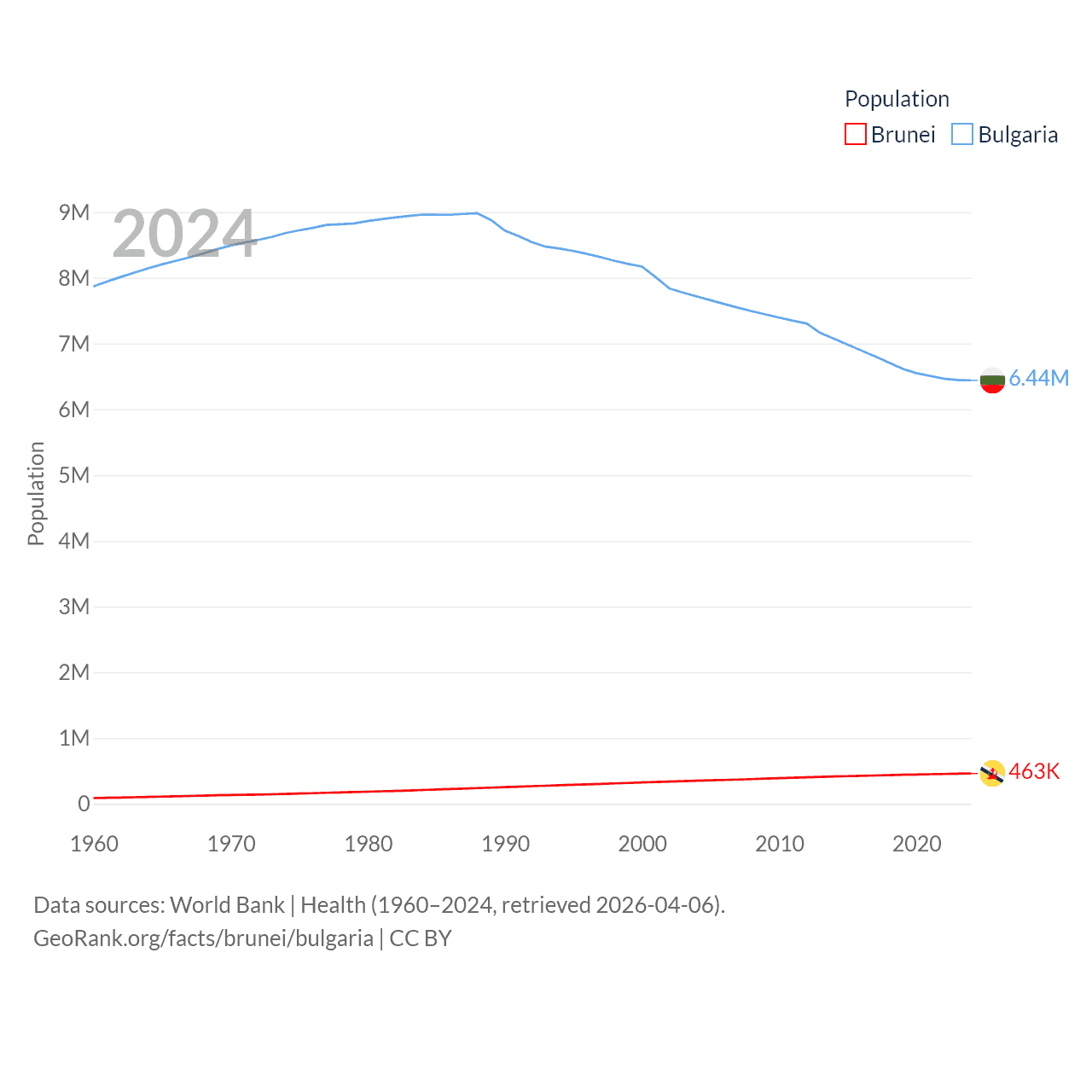 Brunei has a population of 463K (ranked 170/197), compared with 6.44M in Bulgaria (ranked 110/197). Brunei's land area is 2,035 sq mi versus 41,915 sq mi for Bulgaria (ranked 165th vs. 101st).