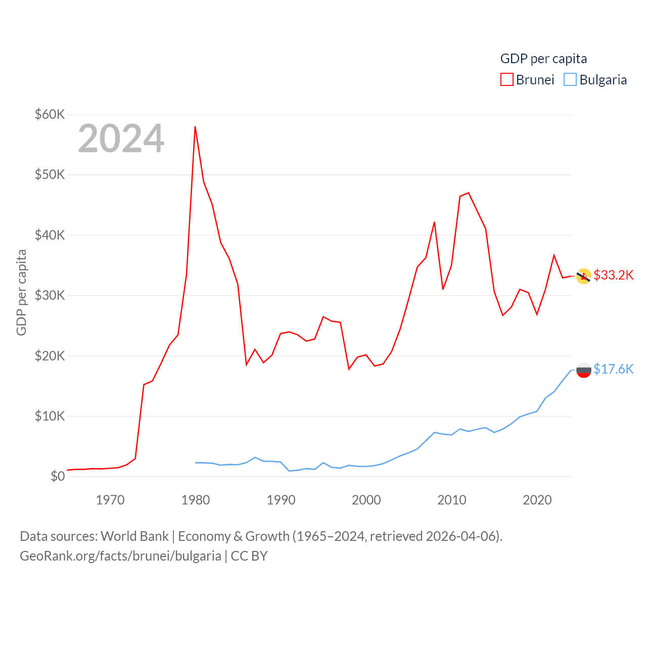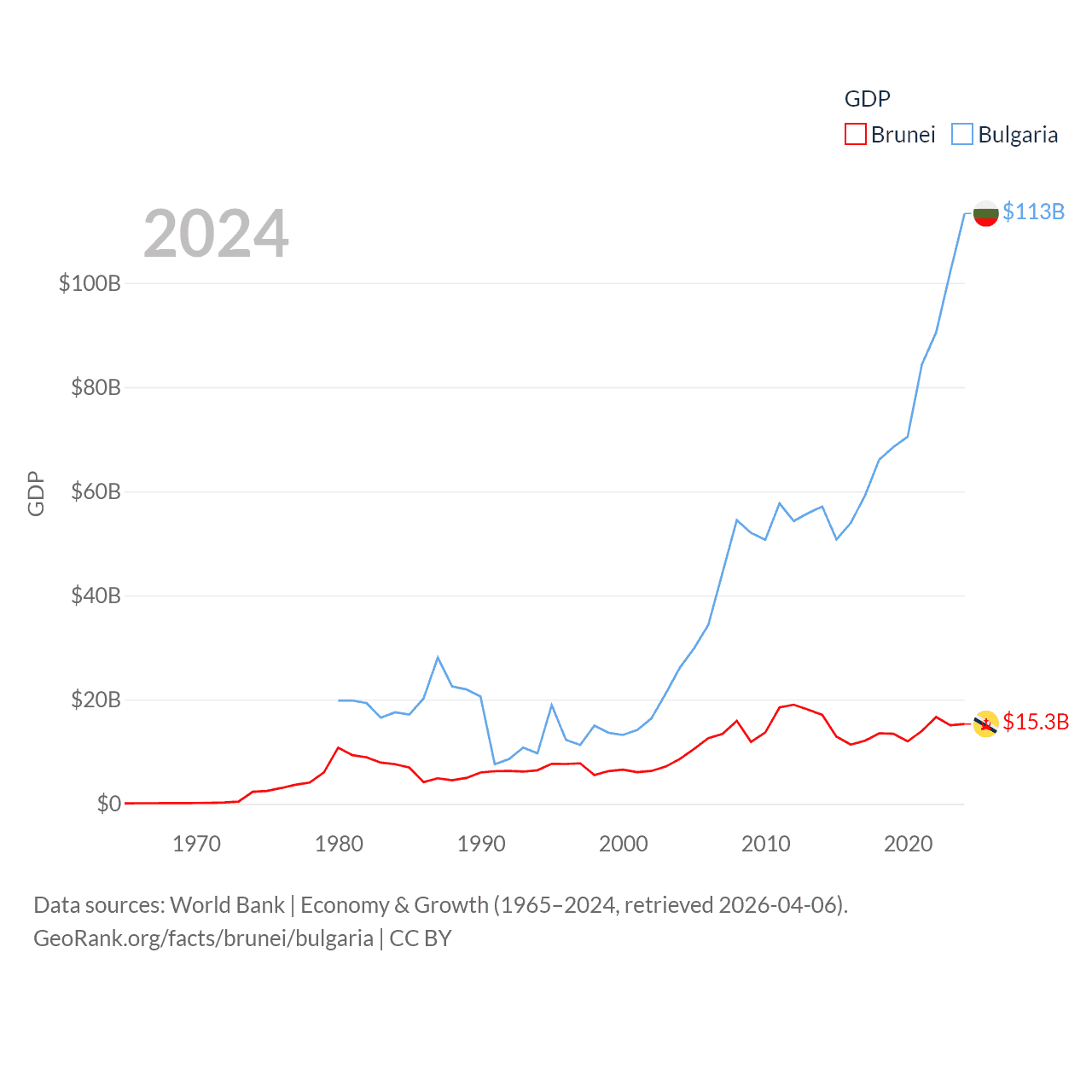 By GDP, Brunei ranks 142/197 ($15.3B) and Bulgaria ranks 67/197 ($113B). By GDP per capita, Brunei ranks 36/197 ($33,153), while Bulgaria ranks 64/197 ($17,596).
