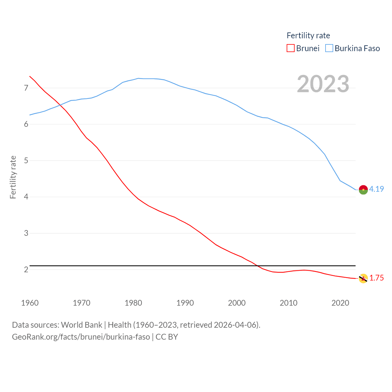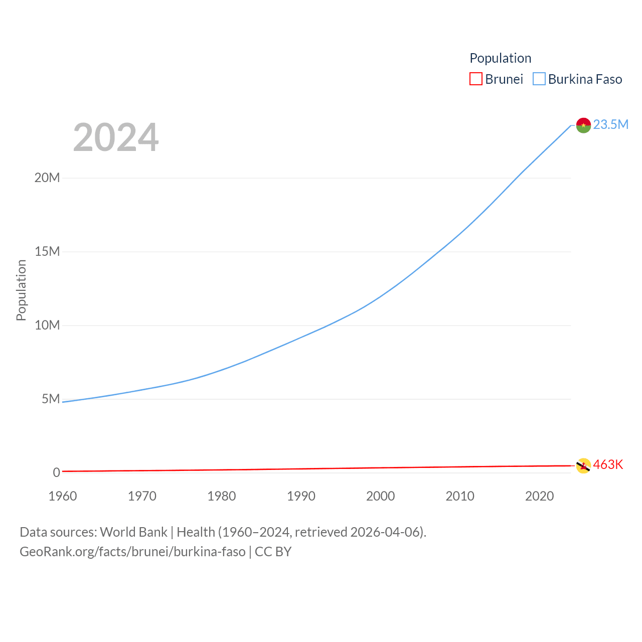 Brunei has a population of 463K (ranked 170/197), compared with 23.5M in Burkina Faso (ranked 59/197). Brunei's land area is 2,035 sq mi versus 105,638 sq mi for Burkina Faso (ranked 165th vs. 73rd).
