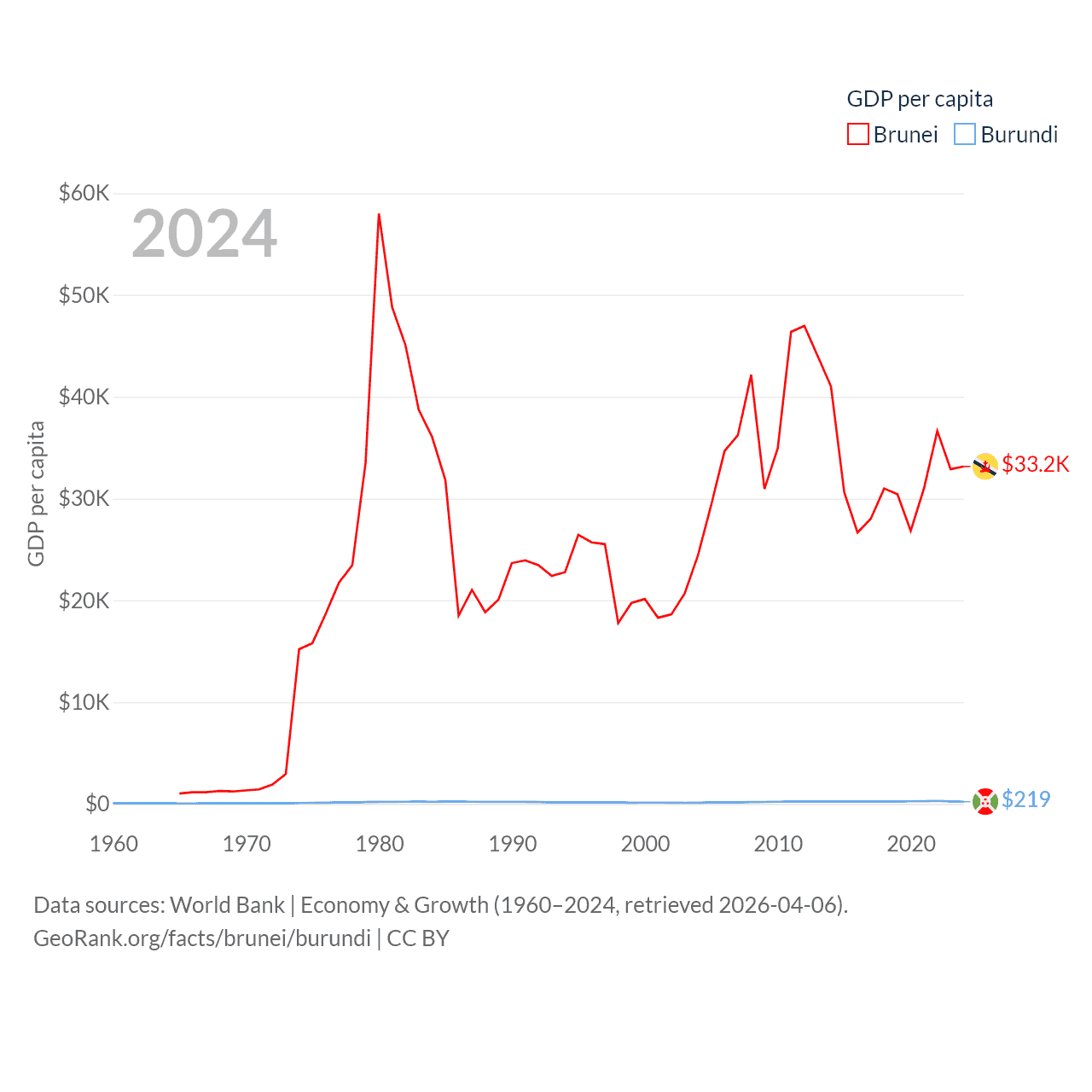 By GDP, Brunei ranks 142/197 ($15.3B) and Burundi ranks 169/197 ($3.08B). By GDP per capita, Brunei ranks 36/197 ($33,153), while Burundi ranks 197/197 ($219.4).