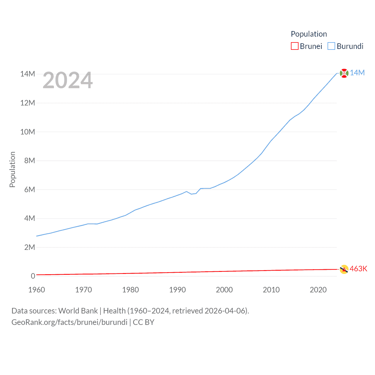 Brunei has a population of 463K (ranked 170/197), compared with 14M in Burundi (ranked 78/197). Brunei's land area is 2,035 sq mi versus 9,915 sq mi for Burundi (ranked 165th vs. 144th).