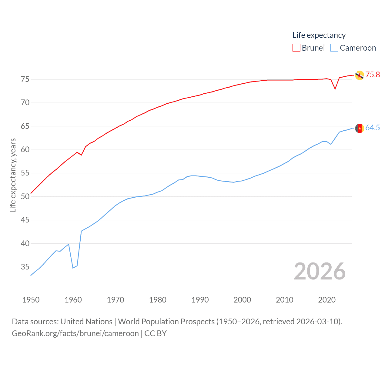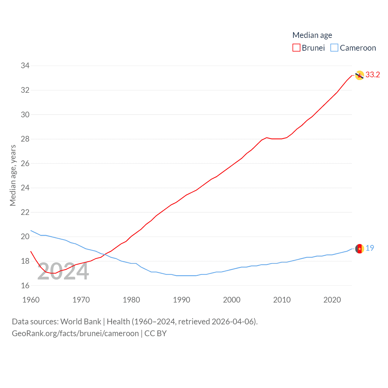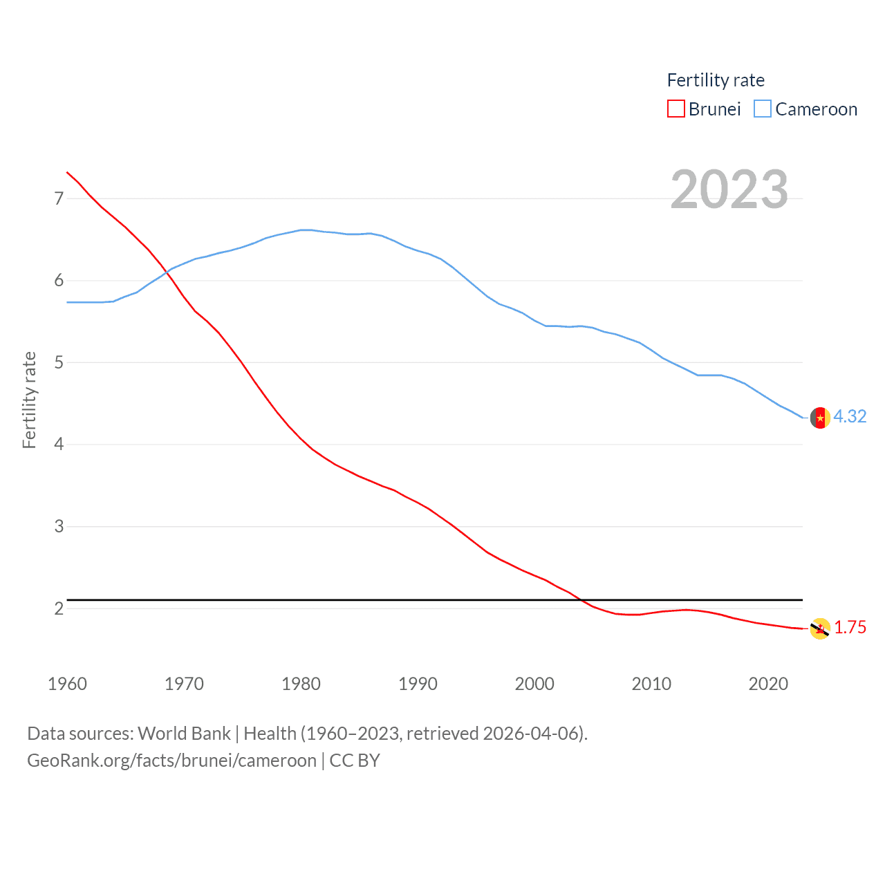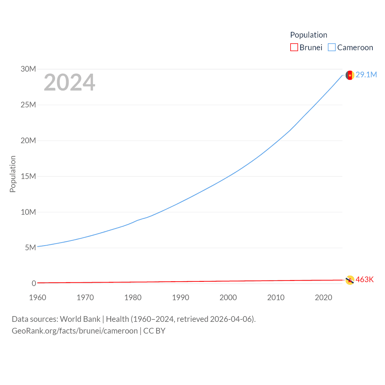 Brunei has a population of 463K (ranked 170/197), compared with 29.1M in Cameroon (ranked 52/197). Brunei's land area is 2,035 sq mi versus 182,514 sq mi for Cameroon (ranked 165th vs. 52nd).