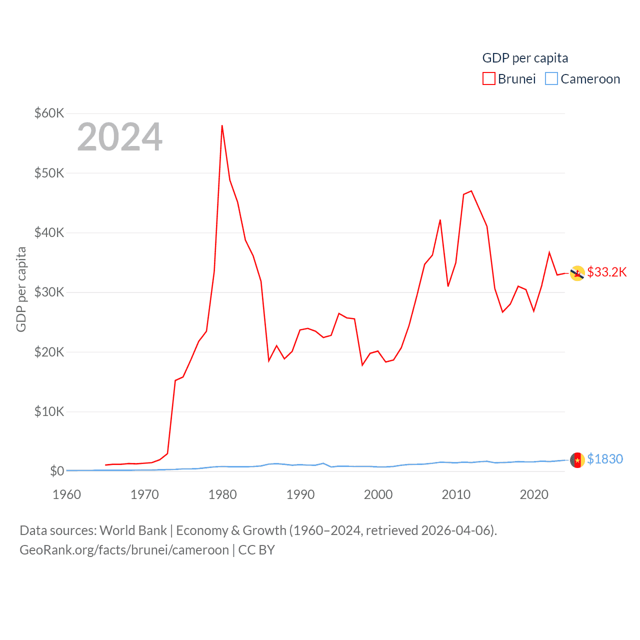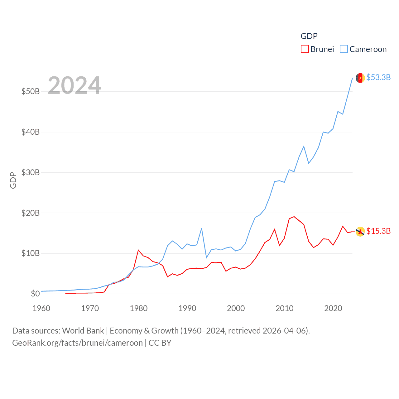 By GDP, Brunei ranks 142/197 ($15.3B) and Cameroon ranks 91/197 ($53.3B). By GDP per capita, Brunei ranks 36/197 ($33,153), while Cameroon ranks 158/197 ($1,830).