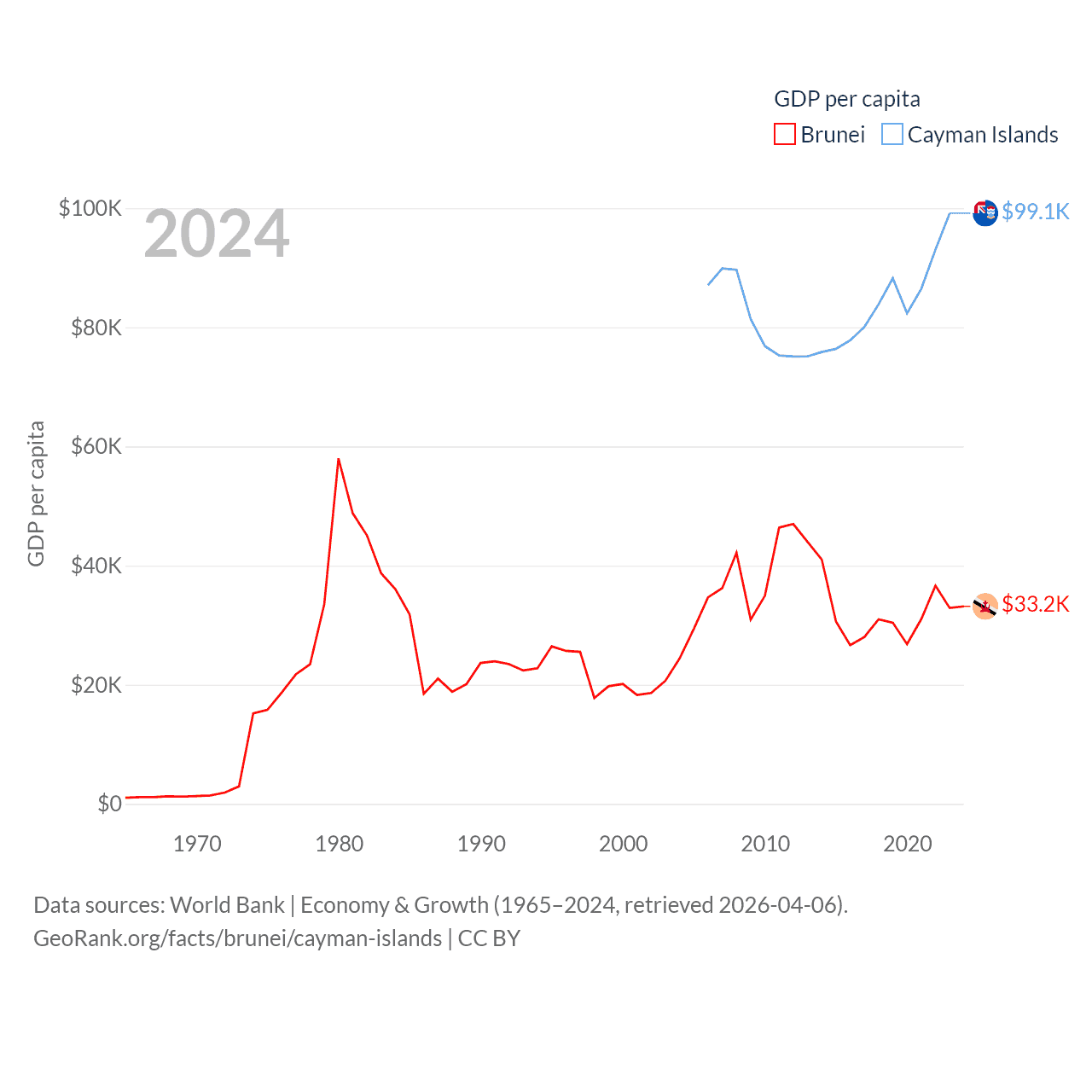 By GDP, Brunei ranks 142/197 ($15.3B) and The Cayman Islands ranks 158/197 ($7.24B). By GDP per capita, Brunei ranks 36/197 ($33,153), while The Cayman Islands ranks 6/197 ($99,144).