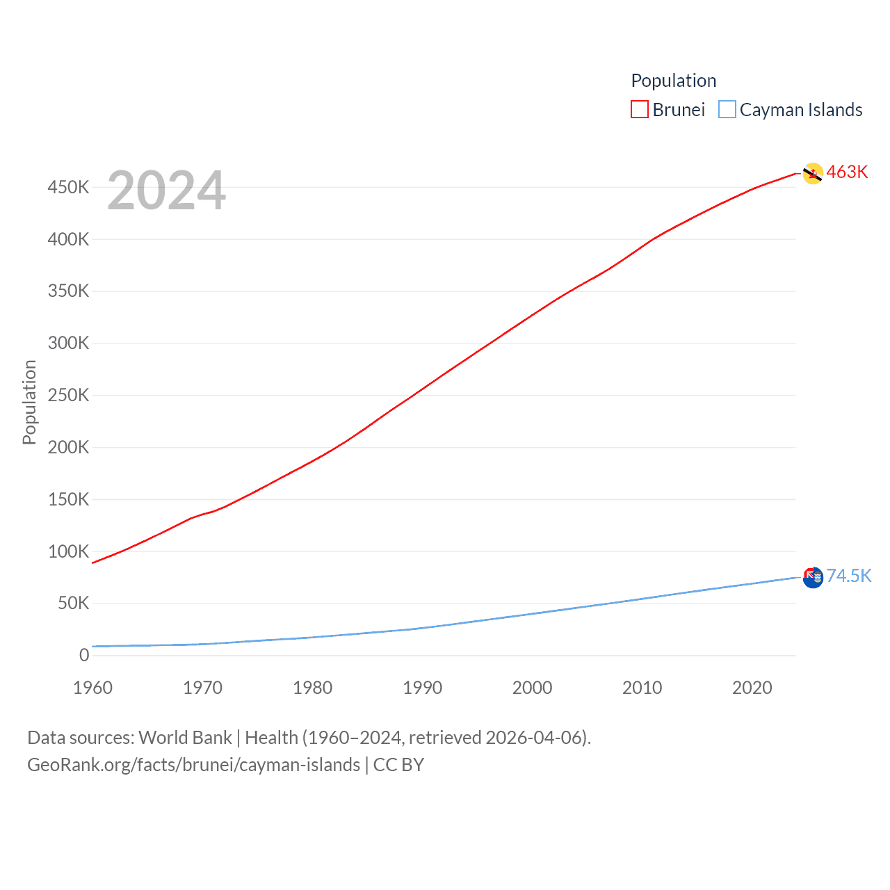 Brunei has a population of 463K (ranked 170/197), compared with 74.5K in The Cayman Islands (ranked 187/197). Brunei's land area is 2,035 sq mi versus 92.7 sq mi for The Cayman Islands (ranked 165th vs. 190th).