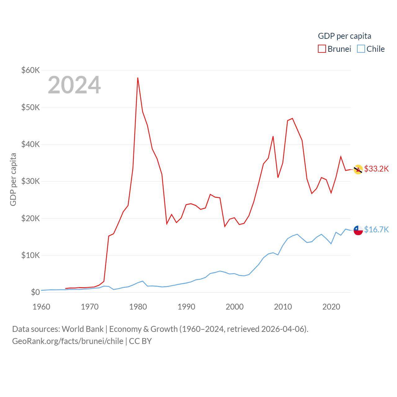 By GDP, Brunei ranks 142/197 ($15.3B) and Chile ranks 45/197 ($330B). By GDP per capita, Brunei ranks 36/197 ($33,153), while Chile ranks 65/197 ($16,710).