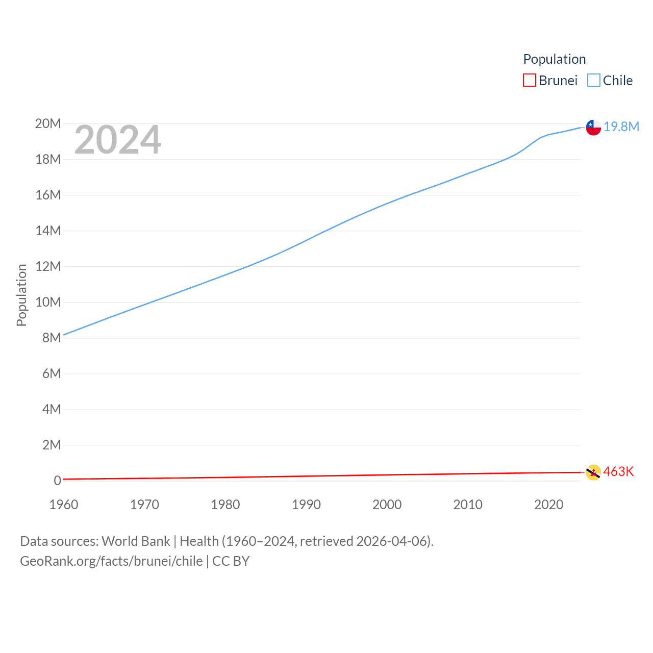 Brunei has a population of 463K (ranked 170/197), compared with 19.8M in Chile (ranked 66/197). Brunei's land area is 2,035 sq mi versus 286,809 sq mi for Chile (ranked 165th vs. 38th).