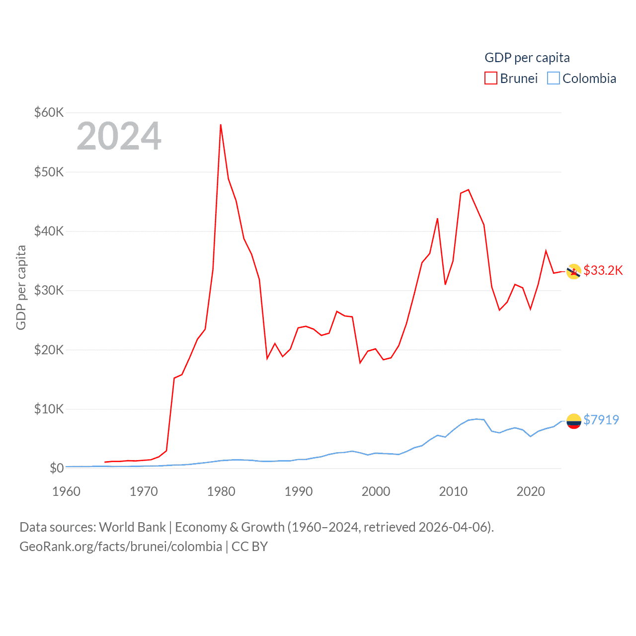 By GDP, Brunei ranks 142/197 ($15.3B) and Colombia ranks 39/197 ($419B). By GDP per capita, Brunei ranks 36/197 ($33,153), while Colombia ranks 94/197 ($7,919).