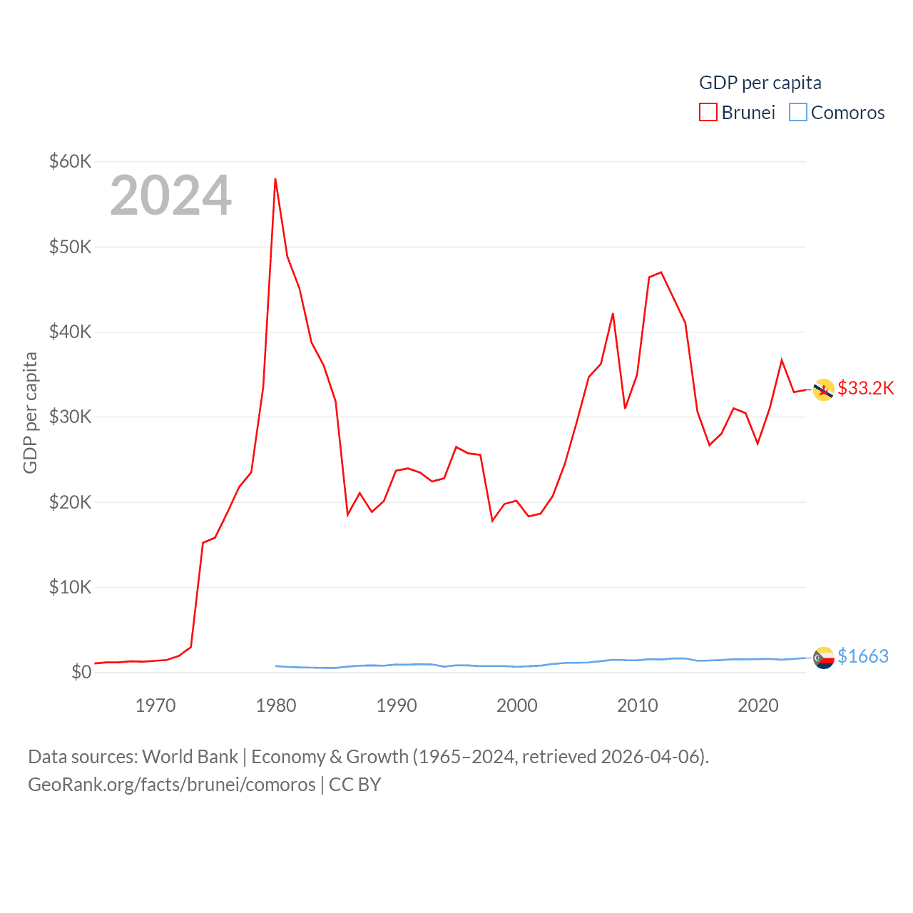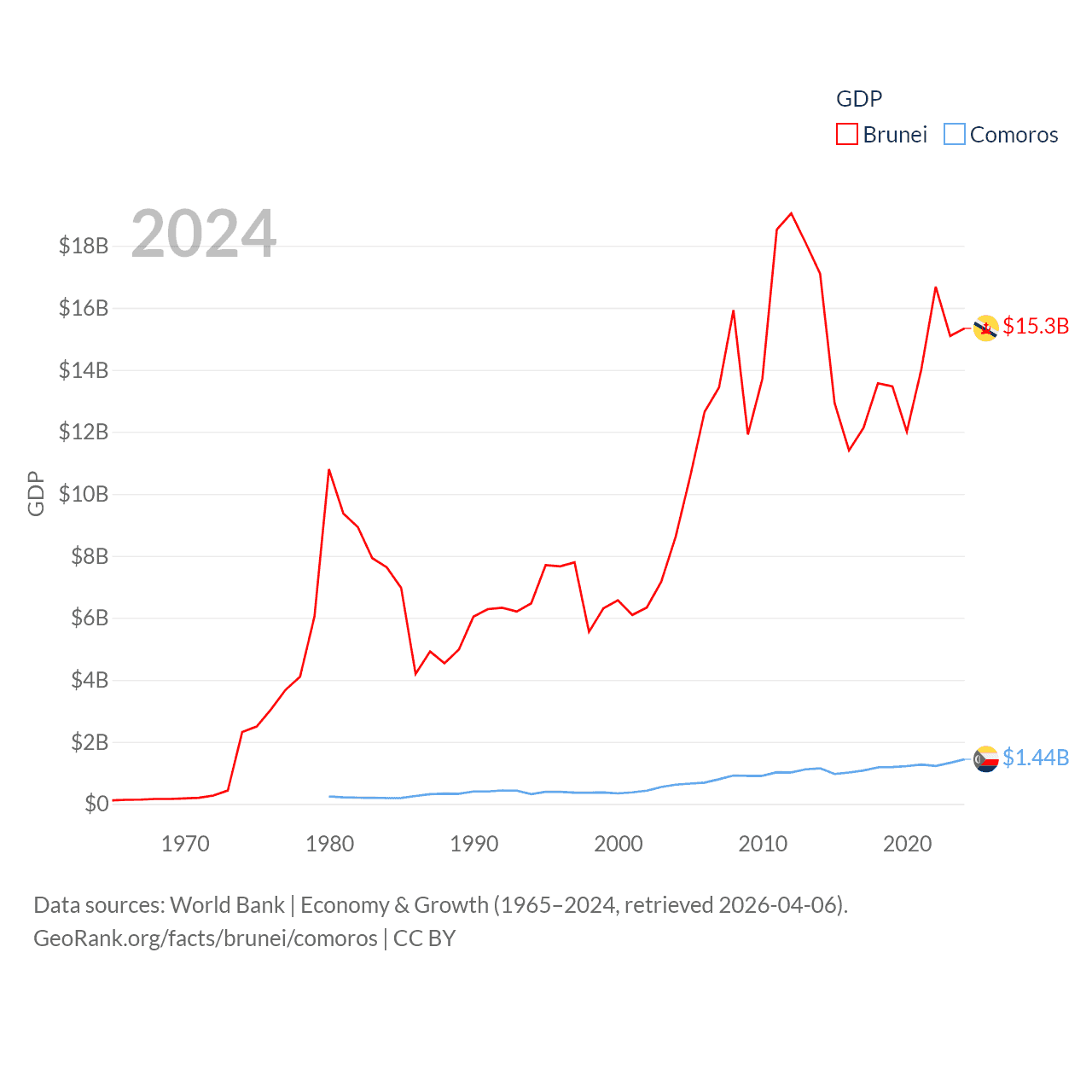 By GDP, Brunei ranks 142/197 ($15.3B) and Comoros ranks 183/197 ($1.44B). By GDP per capita, Brunei ranks 36/197 ($33,153), while Comoros ranks 161/197 ($1,663).