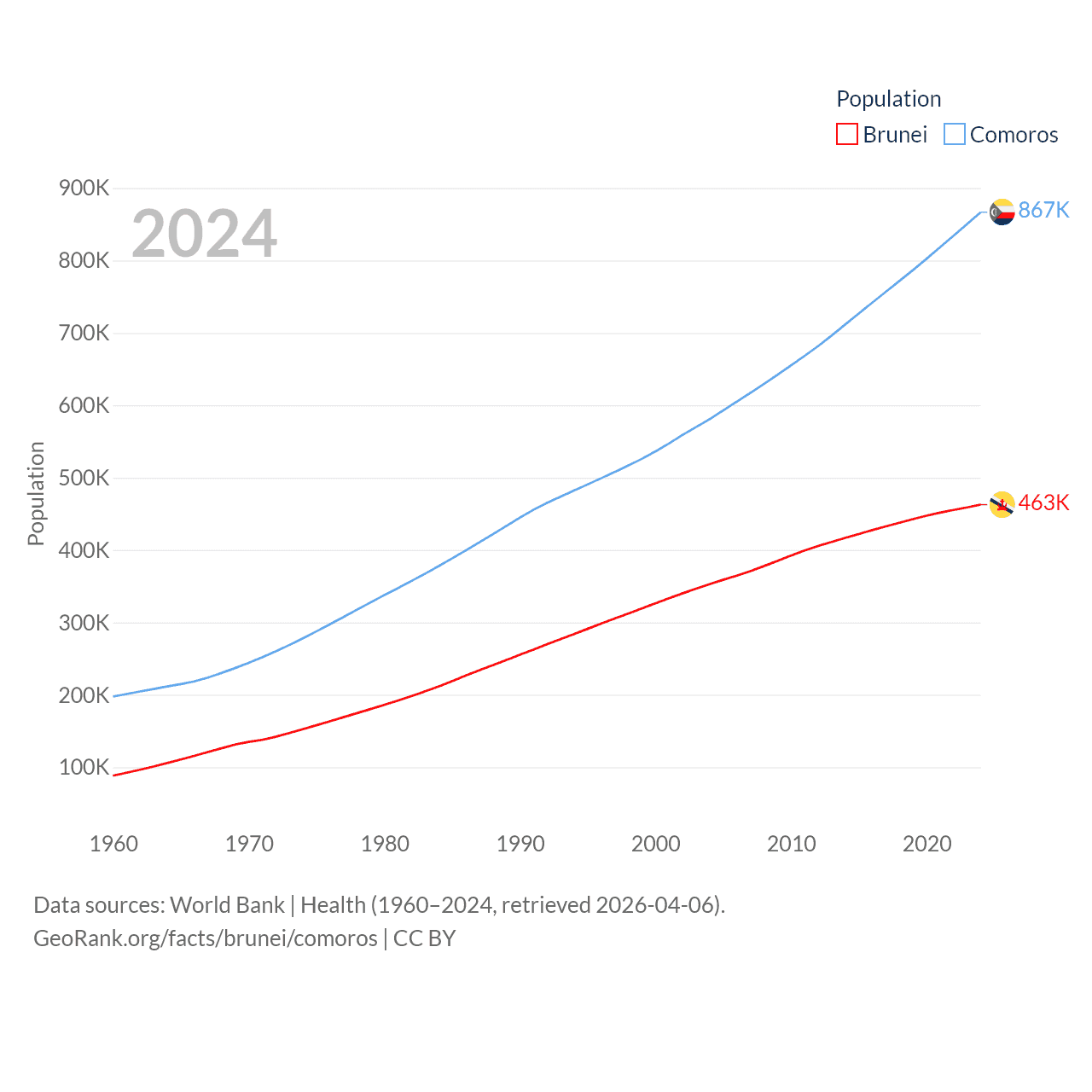 Brunei has a population of 463K (ranked 170/197), compared with 867K in Comoros (ranked 160/197). Brunei's land area is 2,035 sq mi versus 719 sq mi for Comoros (ranked 165th vs. 171st).