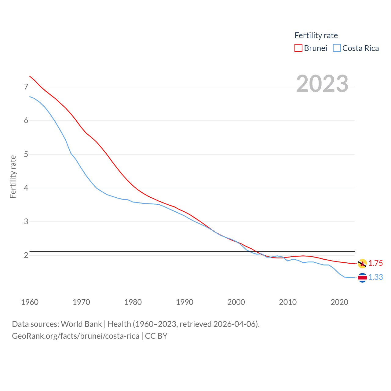 Brunei has a population of 463K (ranked 170/197), compared with 5.13M in Costa Rica (ranked 126/197). Brunei's land area is 2,035 sq mi versus 19,714 sq mi for Costa Rica (ranked 165th vs. 126th).