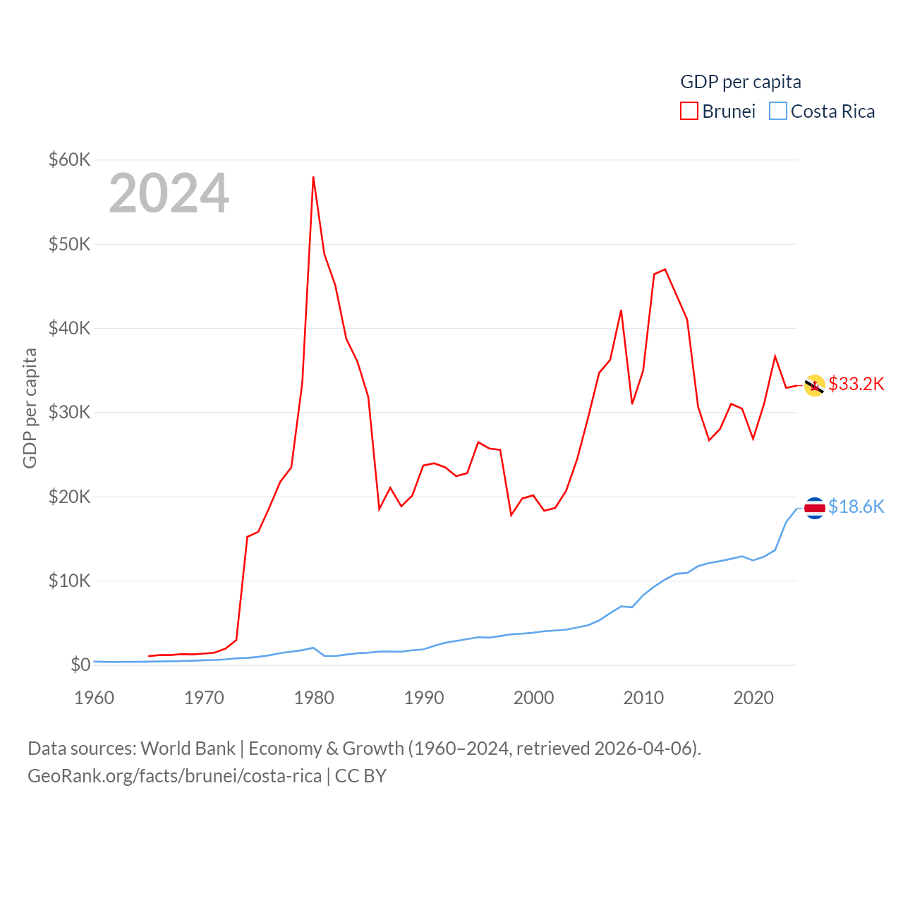 By GDP, Brunei ranks 142/197 ($15.3B) and Costa Rica ranks 73/197 ($95.4B). By GDP per capita, Brunei ranks 36/197 ($33,153), while Costa Rica ranks 62/197 ($18,587).