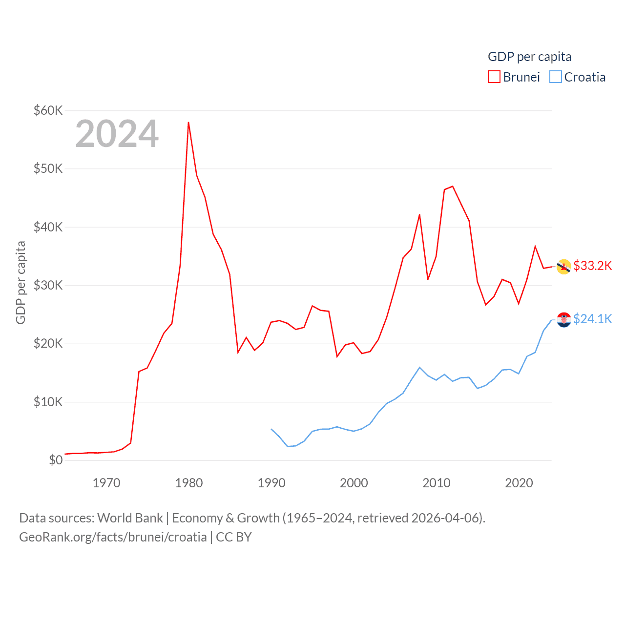 By GDP, Brunei ranks 142/197 ($15.3B) and Croatia ranks 75/197 ($93B). By GDP per capita, Brunei ranks 36/197 ($33,153), while Croatia ranks 50/197 ($24,050).