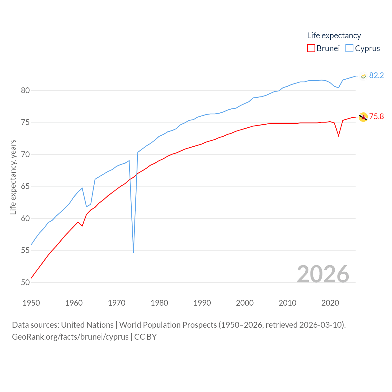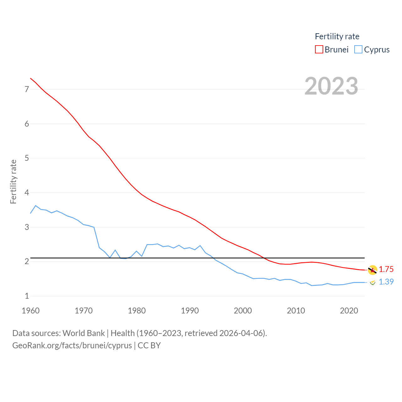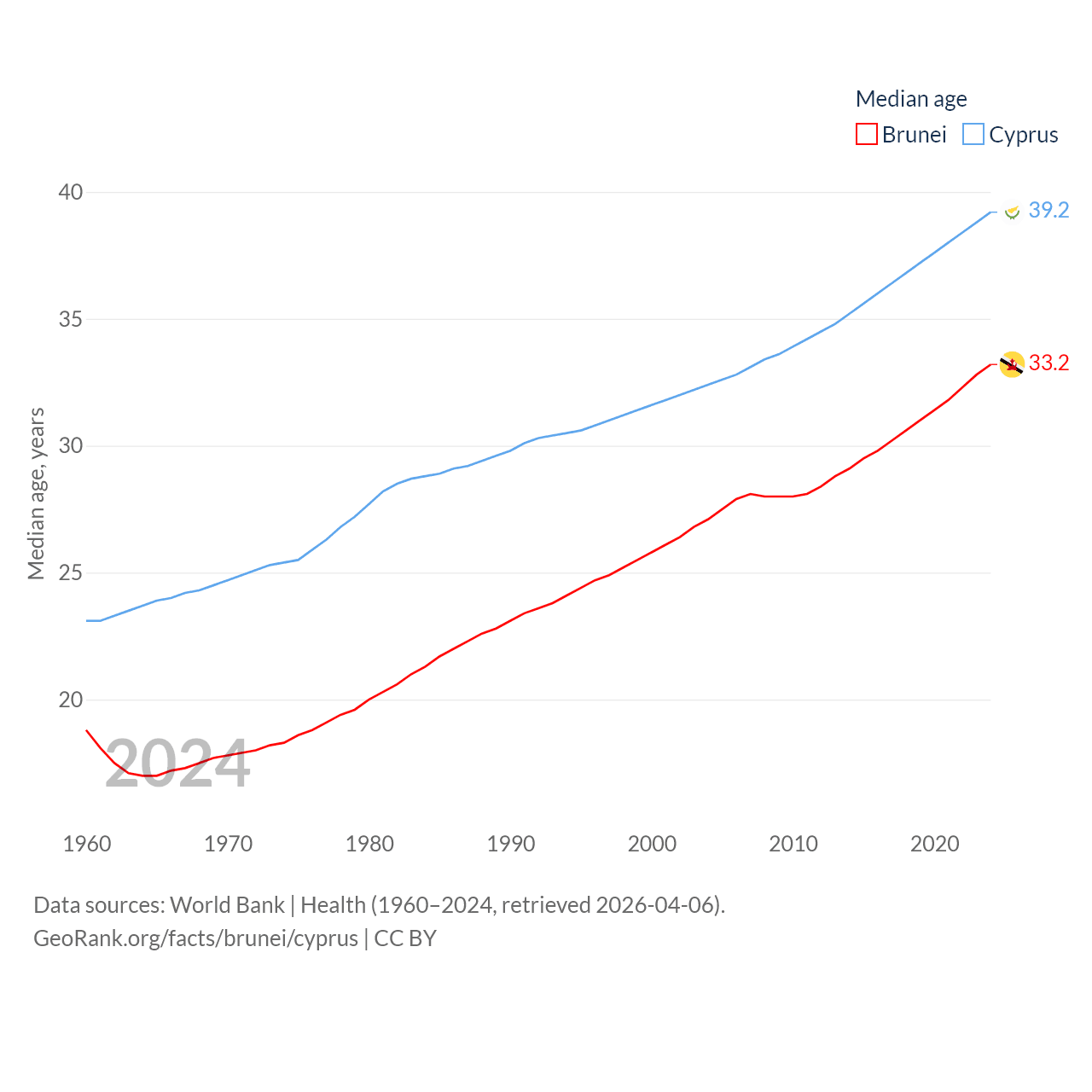 Brunei has a population of 463K (ranked 170/197), compared with 1.36M in Cyprus (ranked 155/197). Brunei's land area is 2,035 sq mi versus 3,568 sq mi for Cyprus (ranked 165th vs. 163rd).