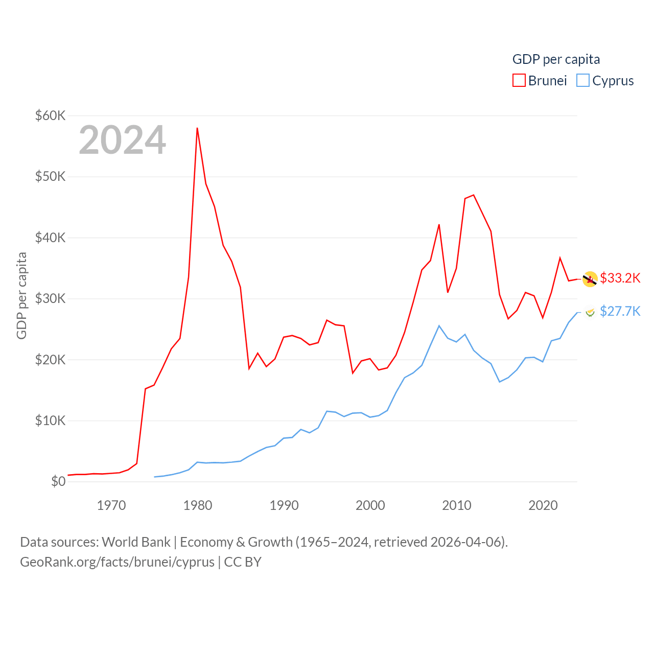 By GDP, Brunei ranks 142/197 ($15.3B) and Cyprus ranks 103/197 ($37.6B). By GDP per capita, Brunei ranks 36/197 ($33,153), while Cyprus ranks 45/197 ($27,707).