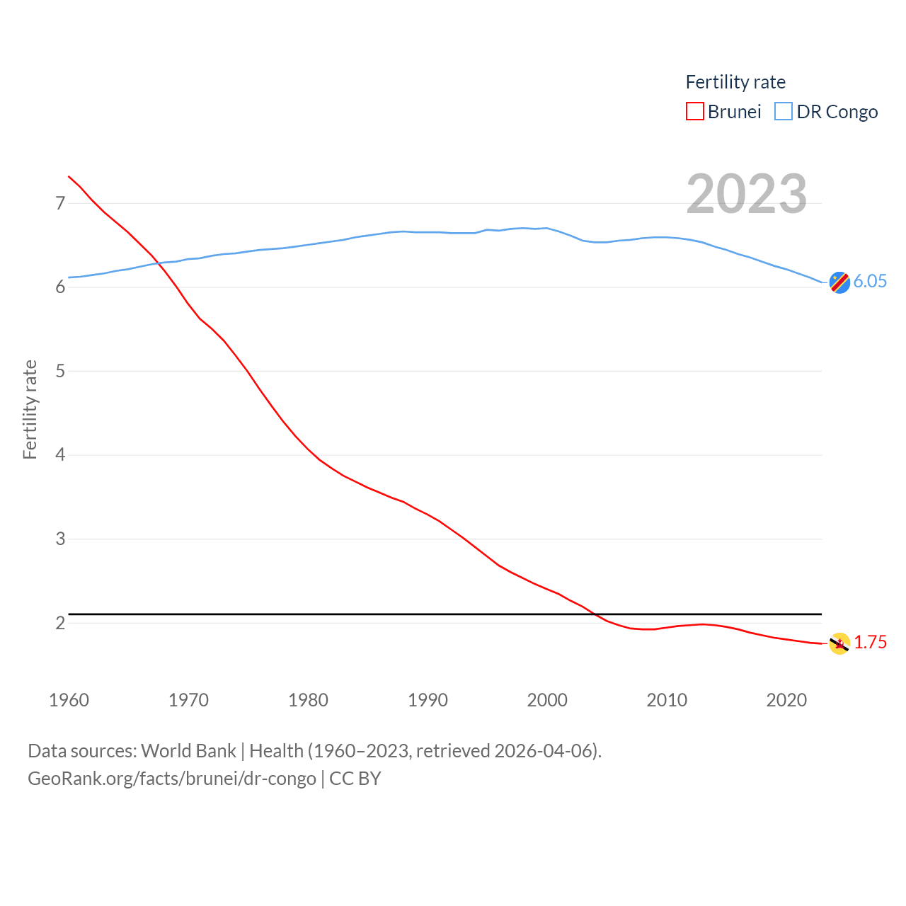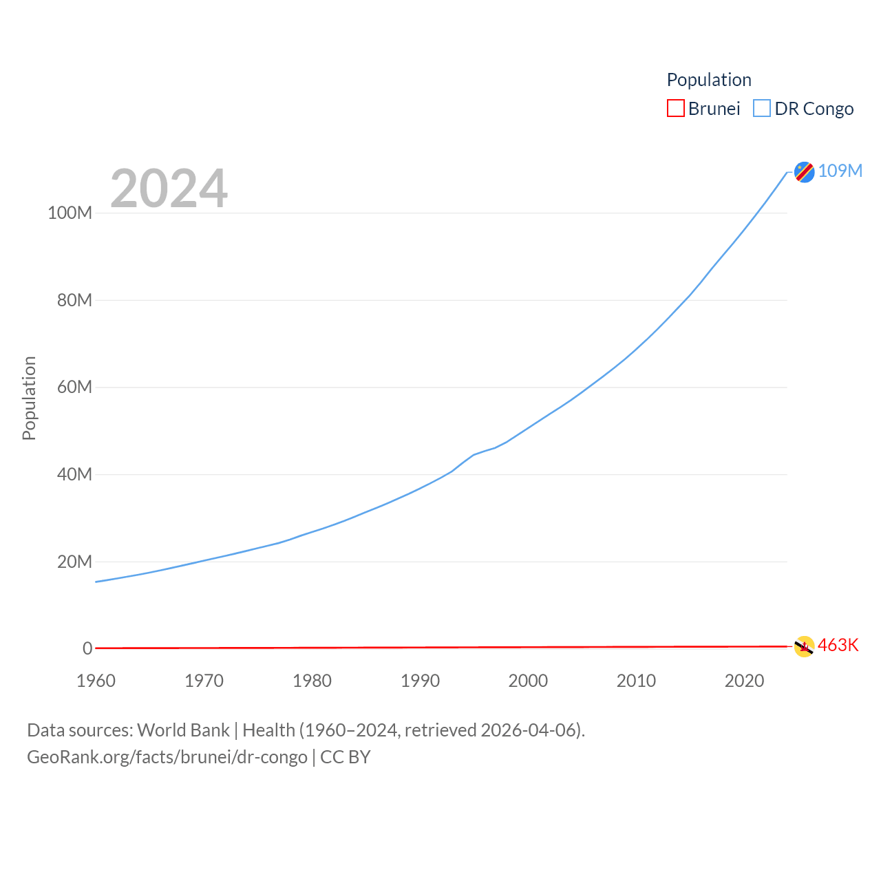 Brunei has a population of 463K (ranked 170/197), compared with 109M in The DR Congo (ranked 15/197). Brunei's land area is 2,035 sq mi versus 875,313 sq mi for The DR Congo (ranked 165th vs. 11th).
