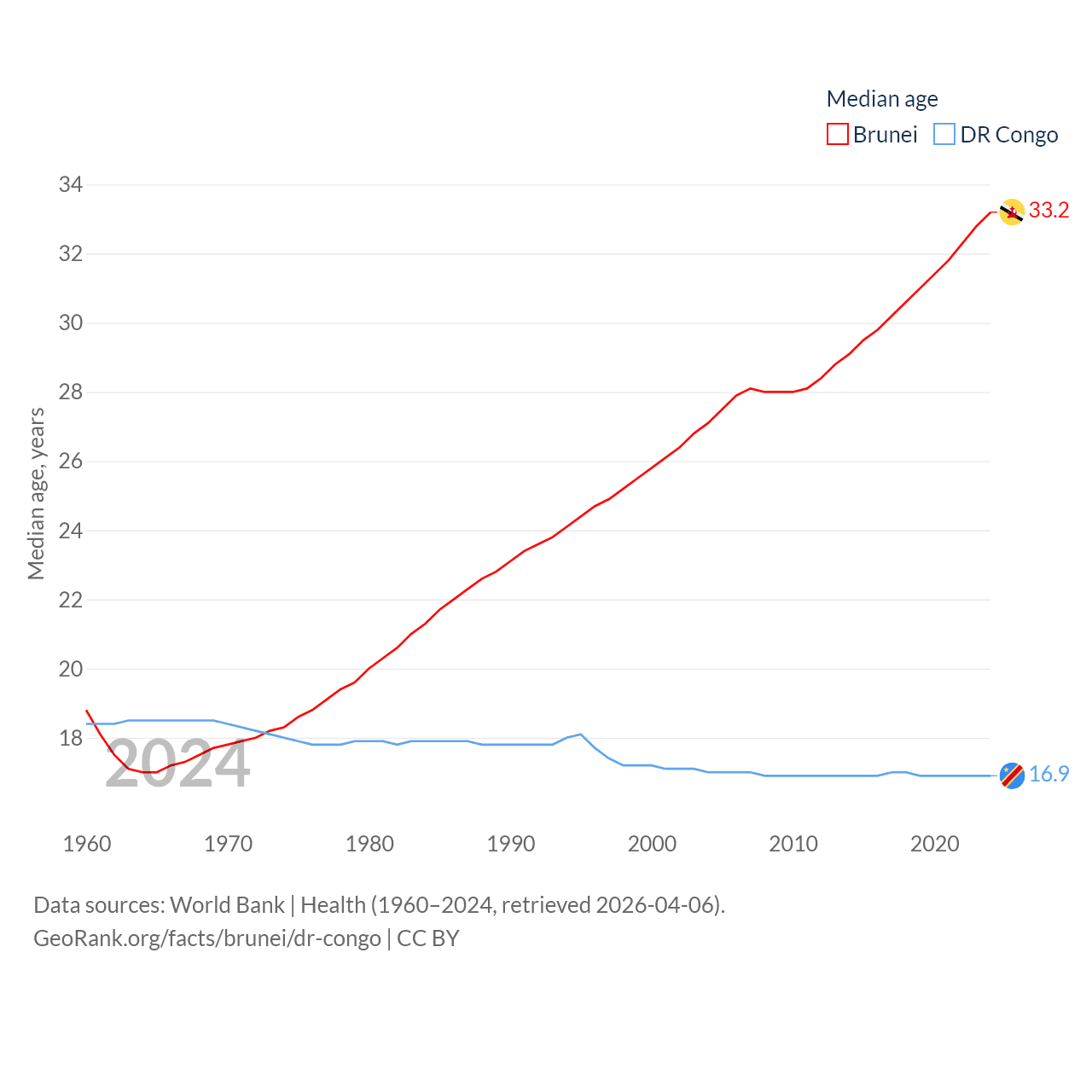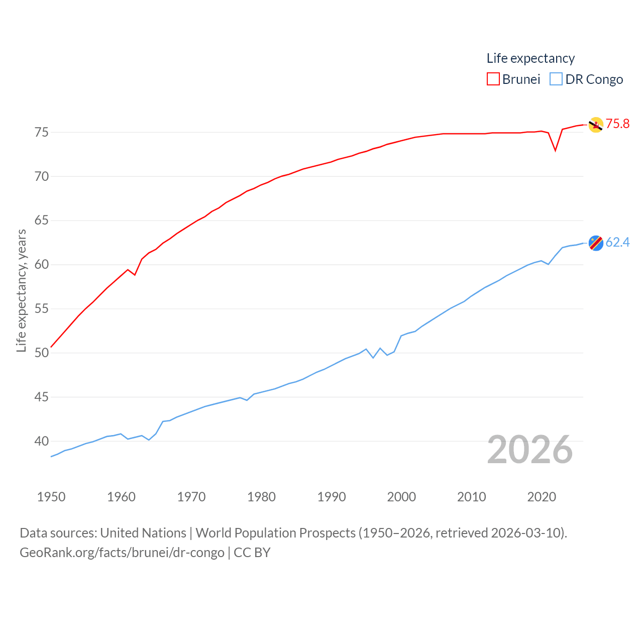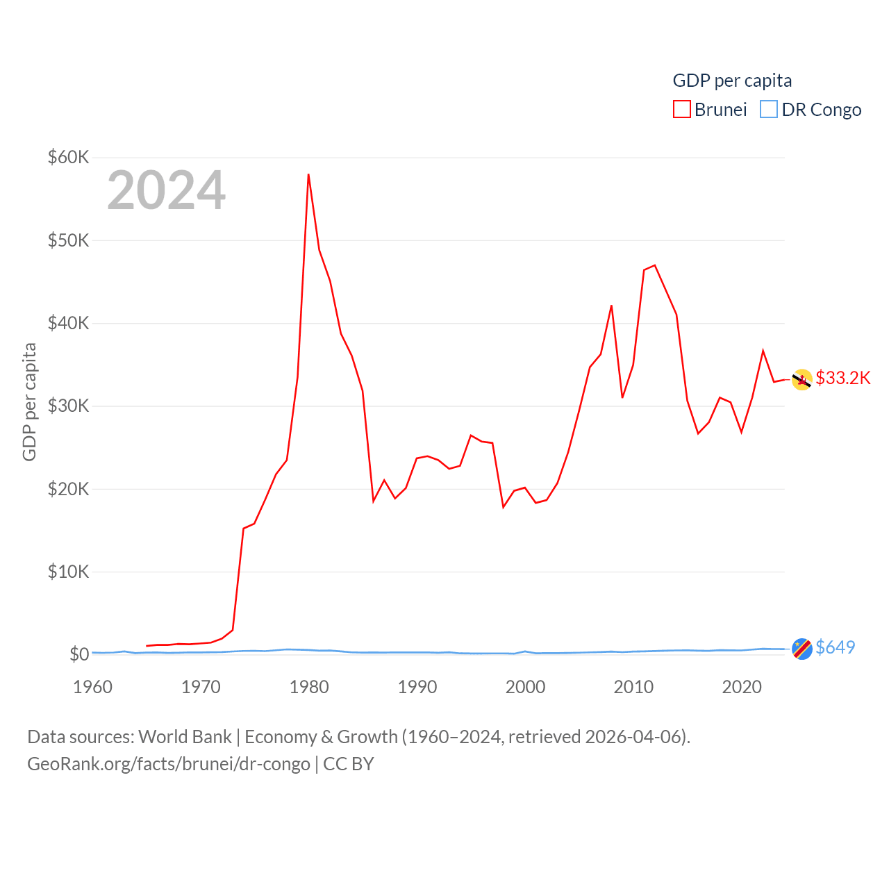 By GDP, Brunei ranks 142/197 ($15.3B) and The DR Congo ranks 87/197 ($71B). By GDP per capita, Brunei ranks 36/197 ($33,153), while The DR Congo ranks 190/197 ($649).