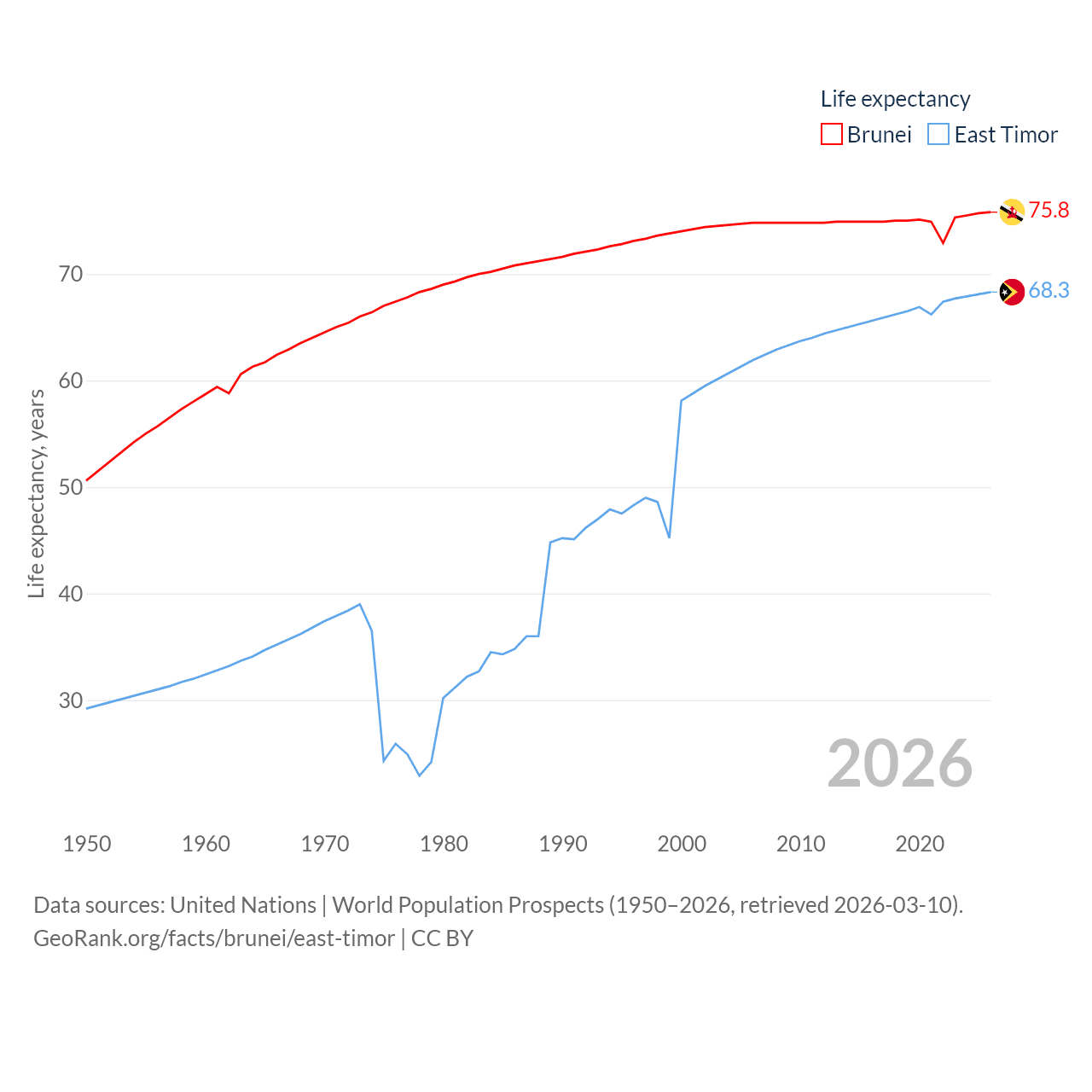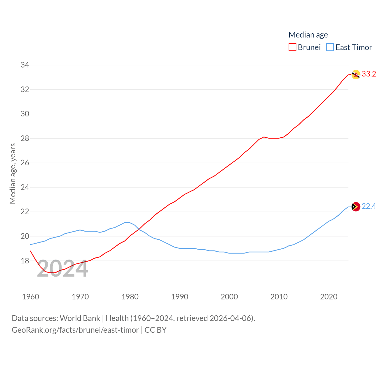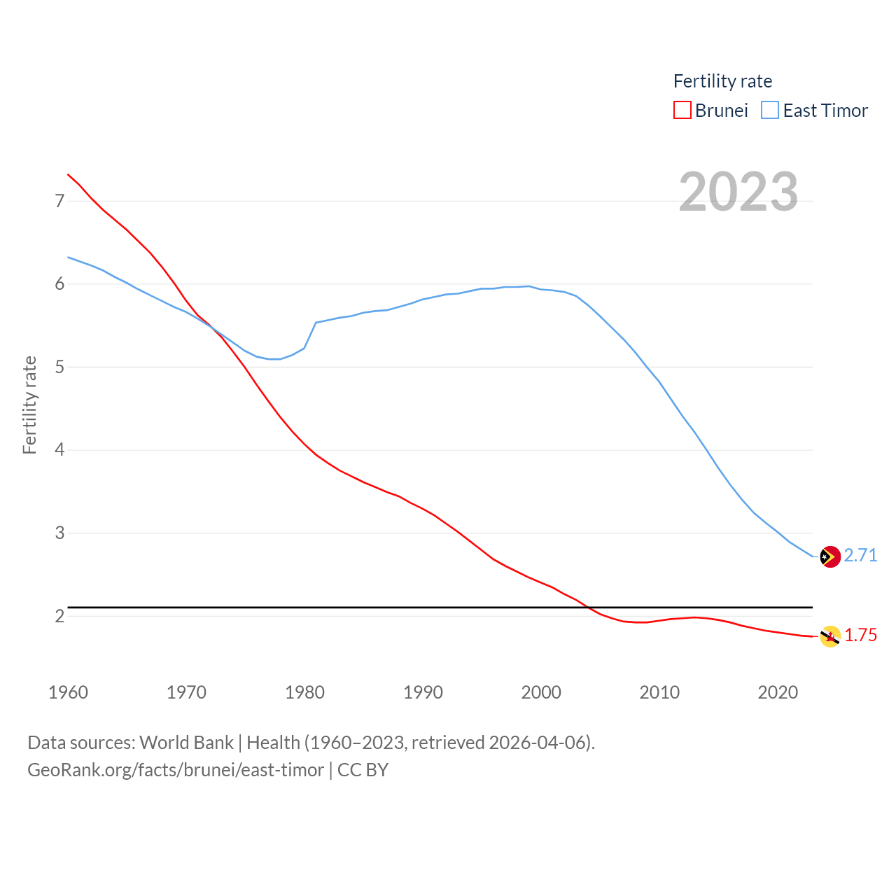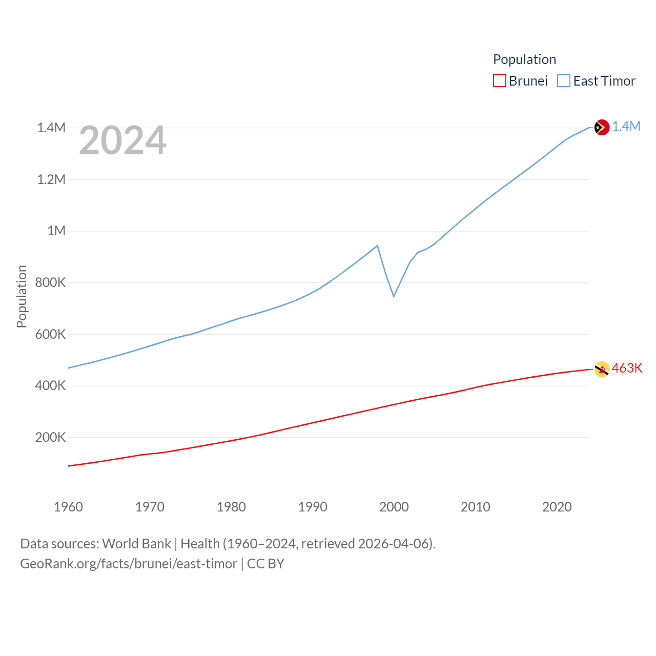 Brunei has a population of 463K (ranked 170/197), compared with 1.4M in East Timor (ranked 152/197). Brunei's land area is 2,035 sq mi versus 5,741 sq mi for East Timor (ranked 165th vs. 155th).