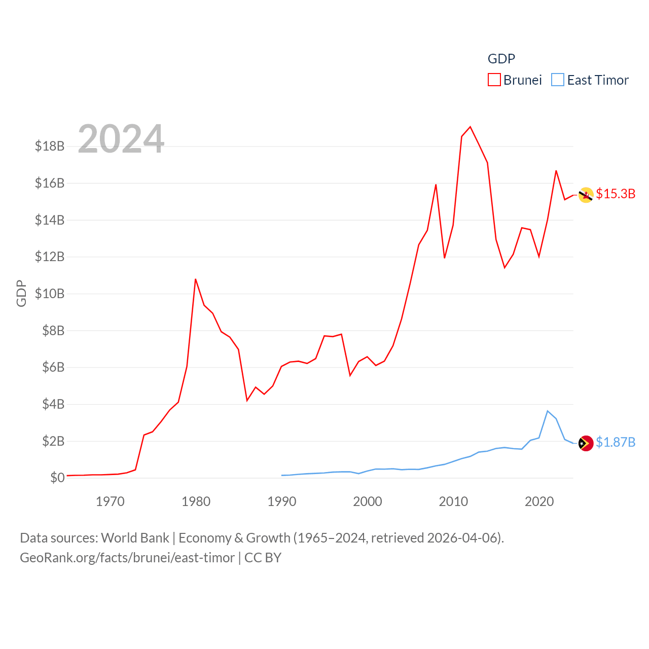 By GDP, Brunei ranks 142/197 ($15.3B) and East Timor ranks 181/197 ($1.87B). By GDP per capita, Brunei ranks 36/197 ($33,153), while East Timor ranks 167/197 ($1,332).