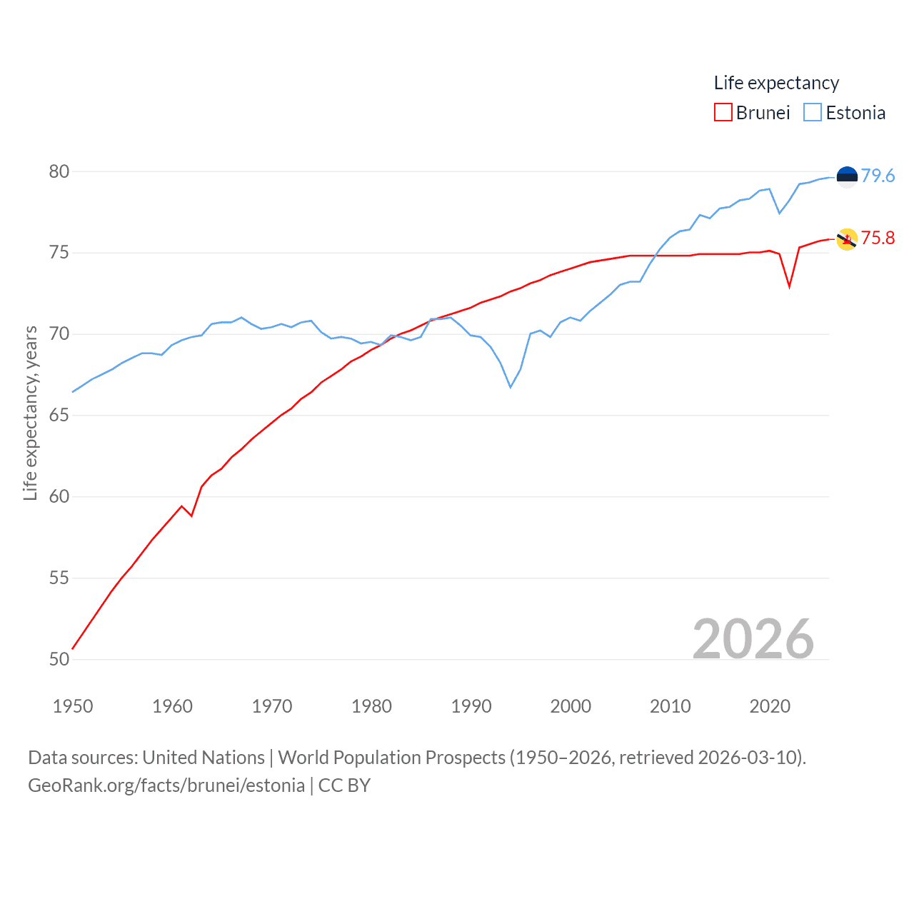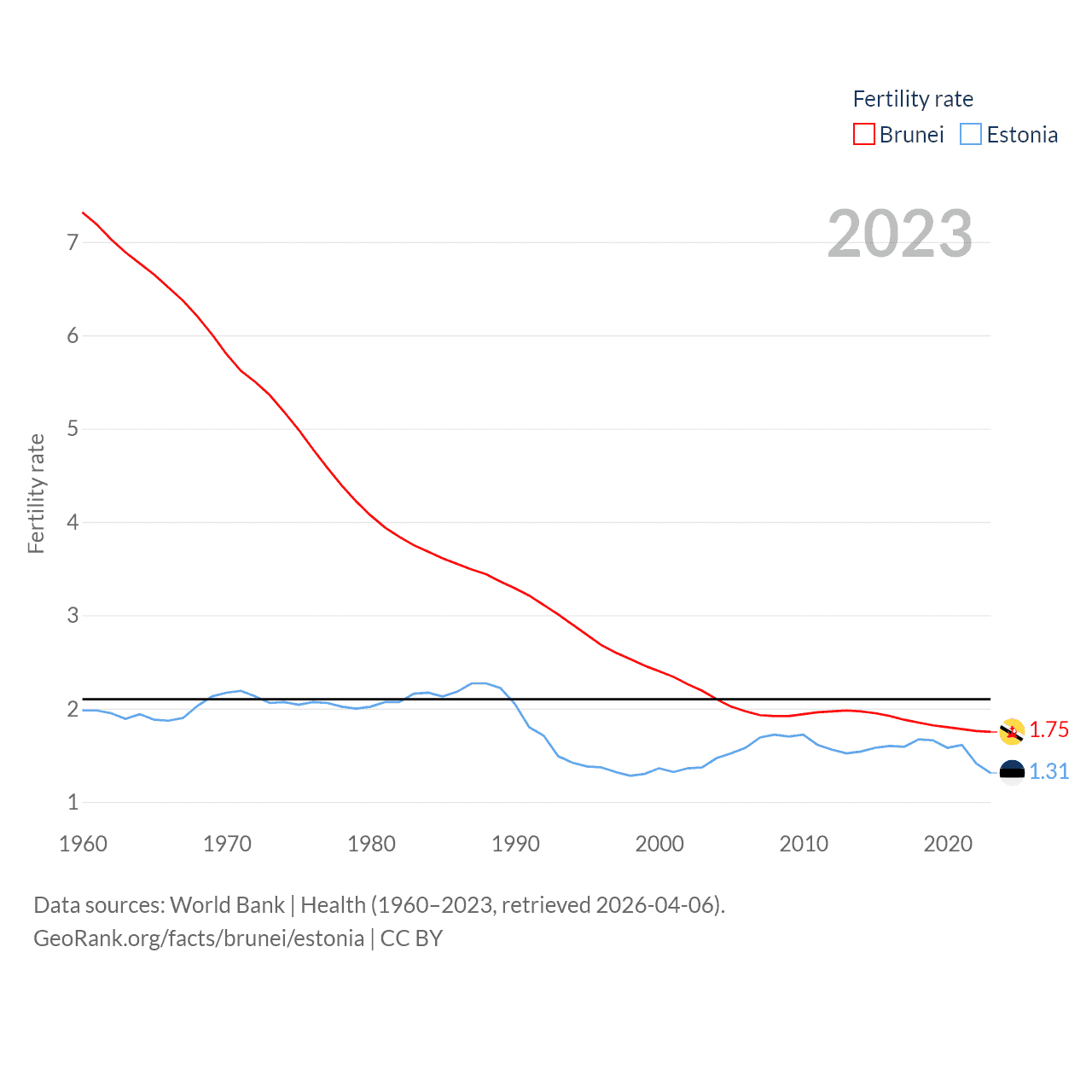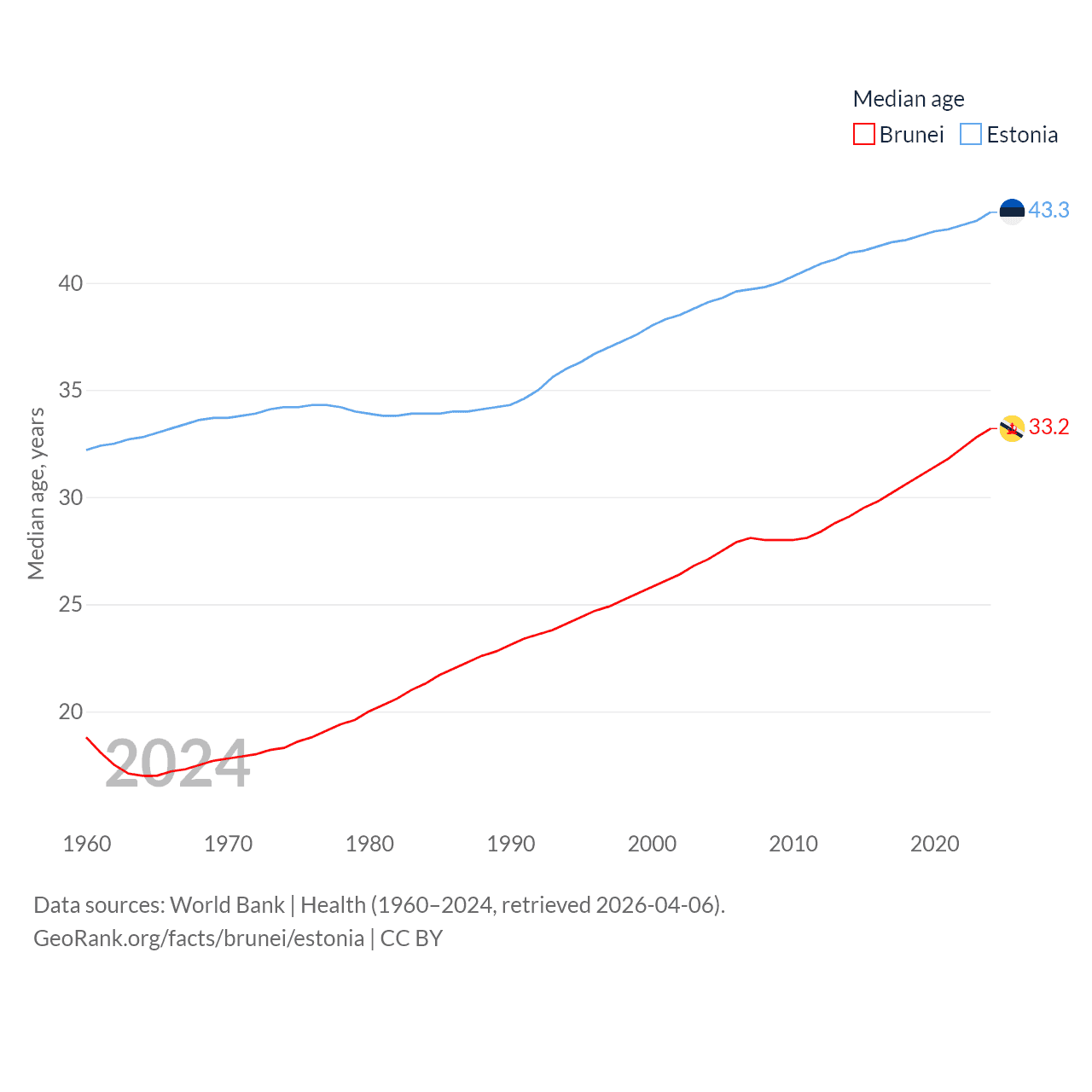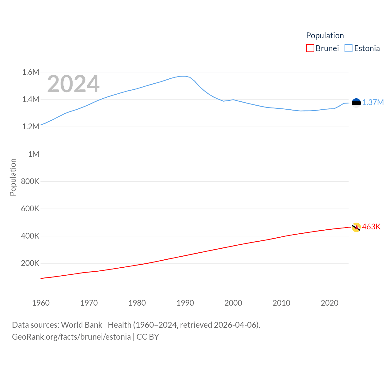 Brunei has a population of 463K (ranked 170/197), compared with 1.37M in Estonia (ranked 153/197). Brunei's land area is 2,035 sq mi versus 16,498 sq mi for Estonia (ranked 165th vs. 129th).