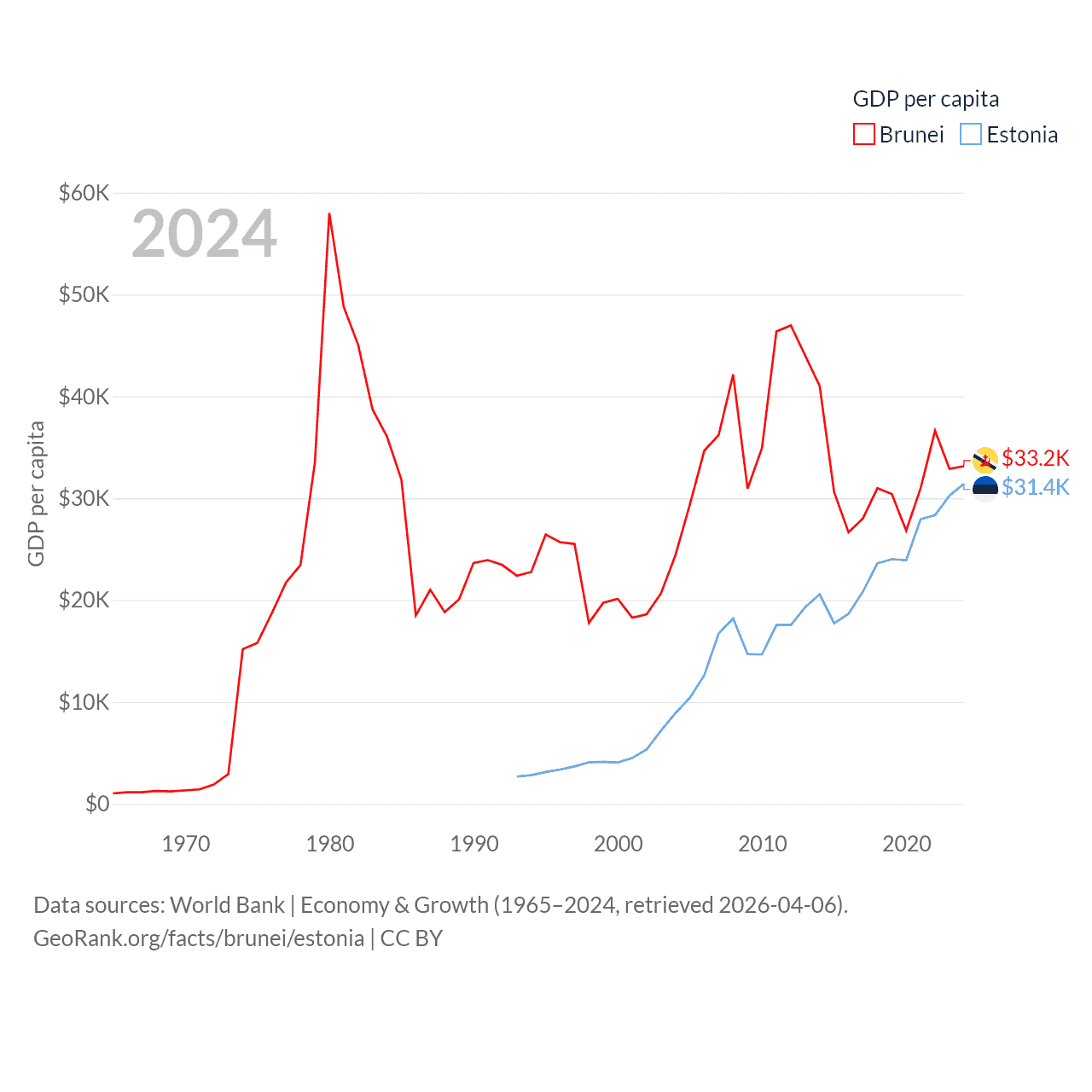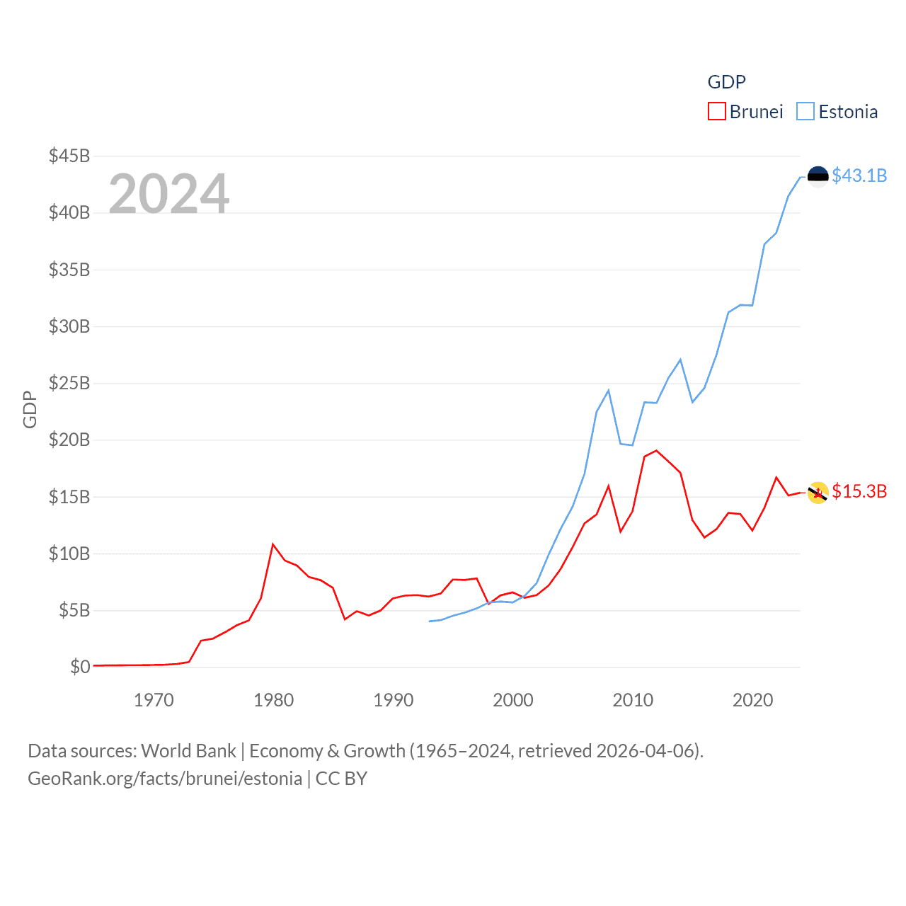 By GDP, Brunei ranks 142/197 ($15.3B) and Estonia ranks 100/197 ($43.1B). By GDP per capita, Brunei ranks 36/197 ($33,153), while Estonia ranks 40/197 ($31,428).