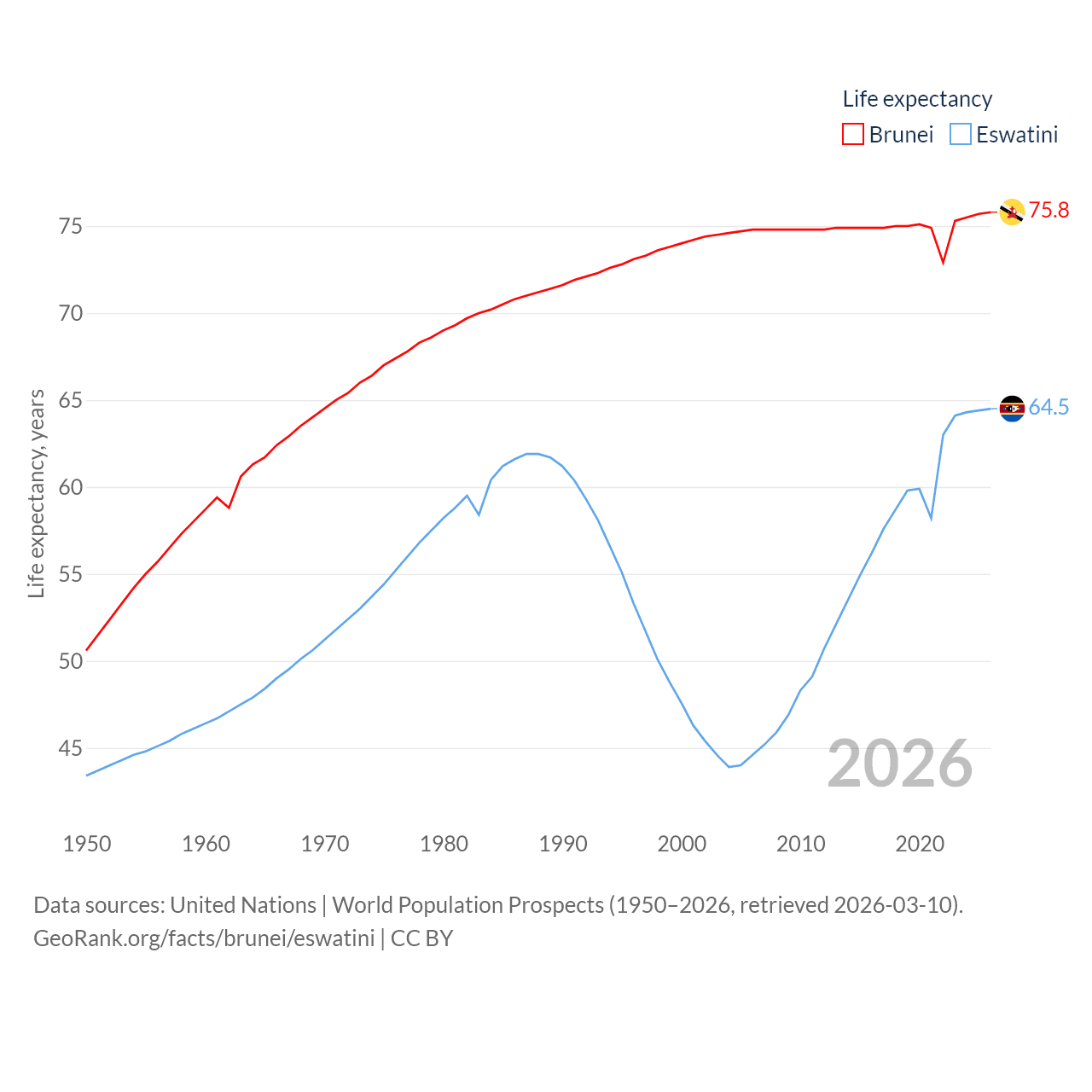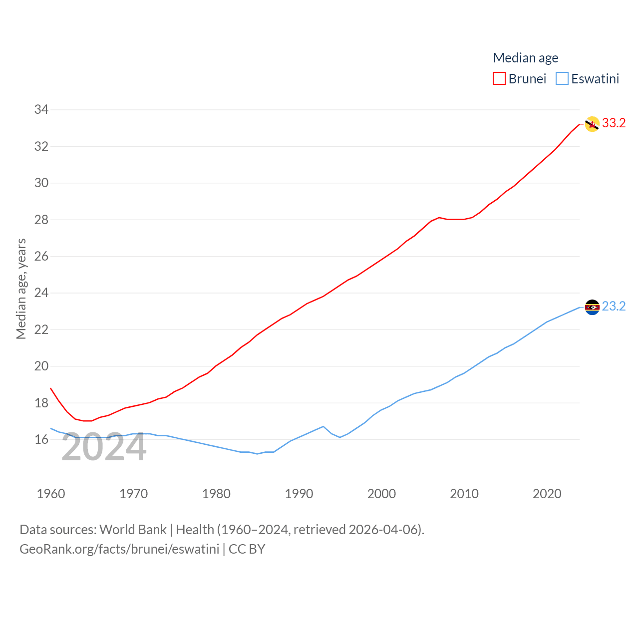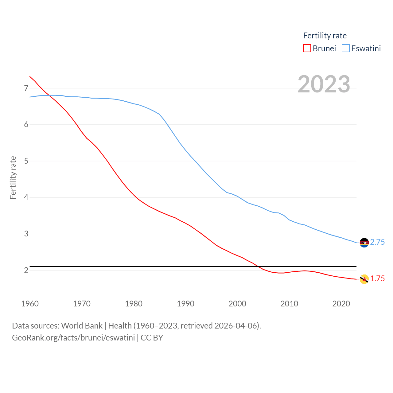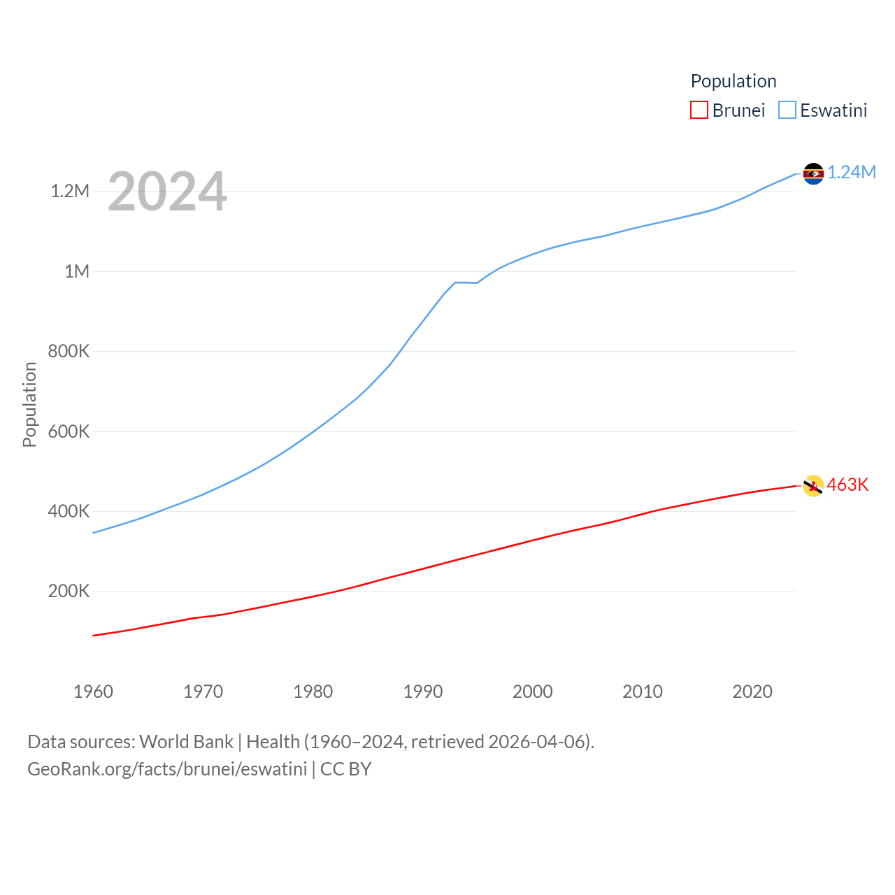 Brunei has a population of 463K (ranked 170/197), compared with 1.24M in Eswatini (ranked 157/197). Brunei's land area is 2,035 sq mi versus 6,641 sq mi for Eswatini (ranked 165th vs. 154th).