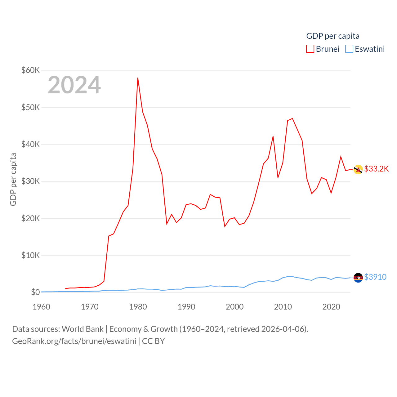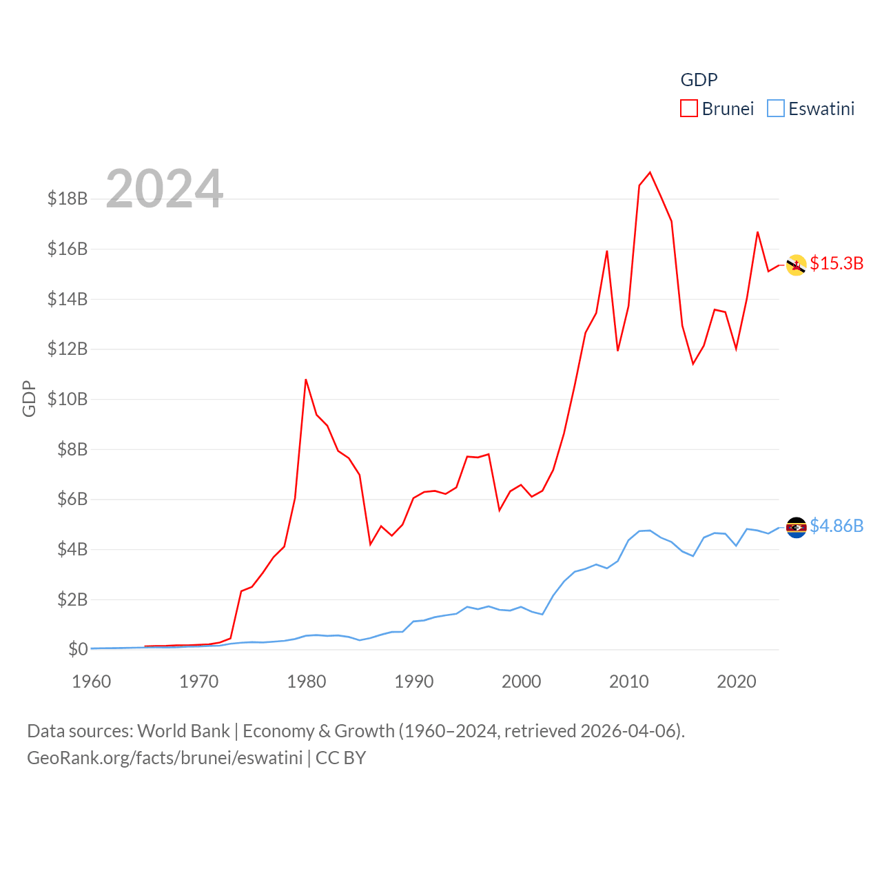 By GDP, Brunei ranks 142/197 ($15.3B) and Eswatini ranks 162/197 ($4.86B). By GDP per capita, Brunei ranks 36/197 ($33,153), while Eswatini ranks 131/197 ($3,910).