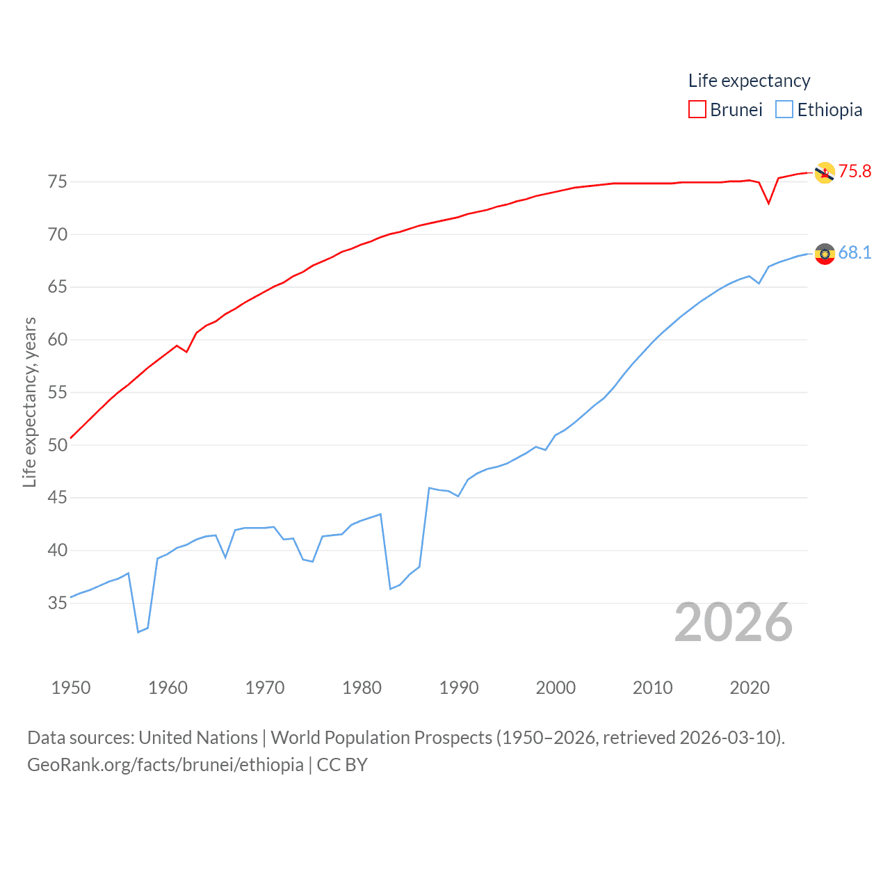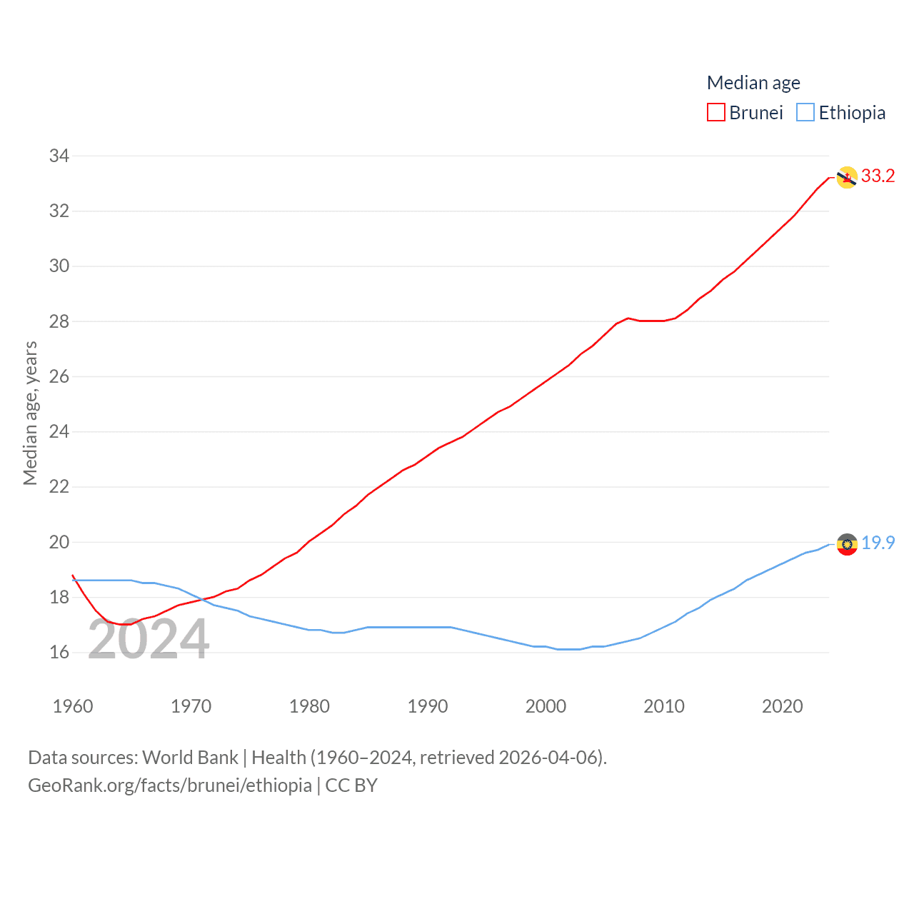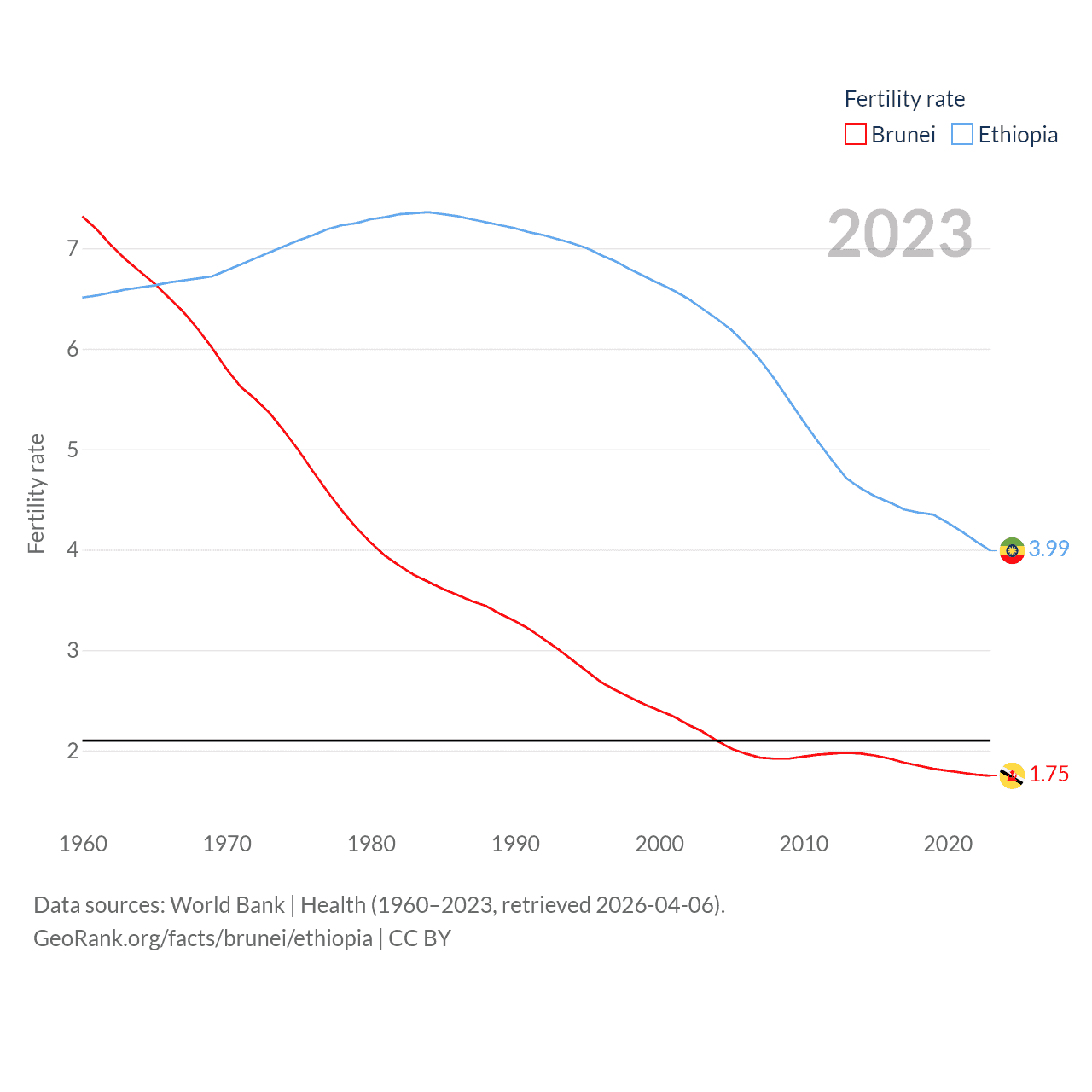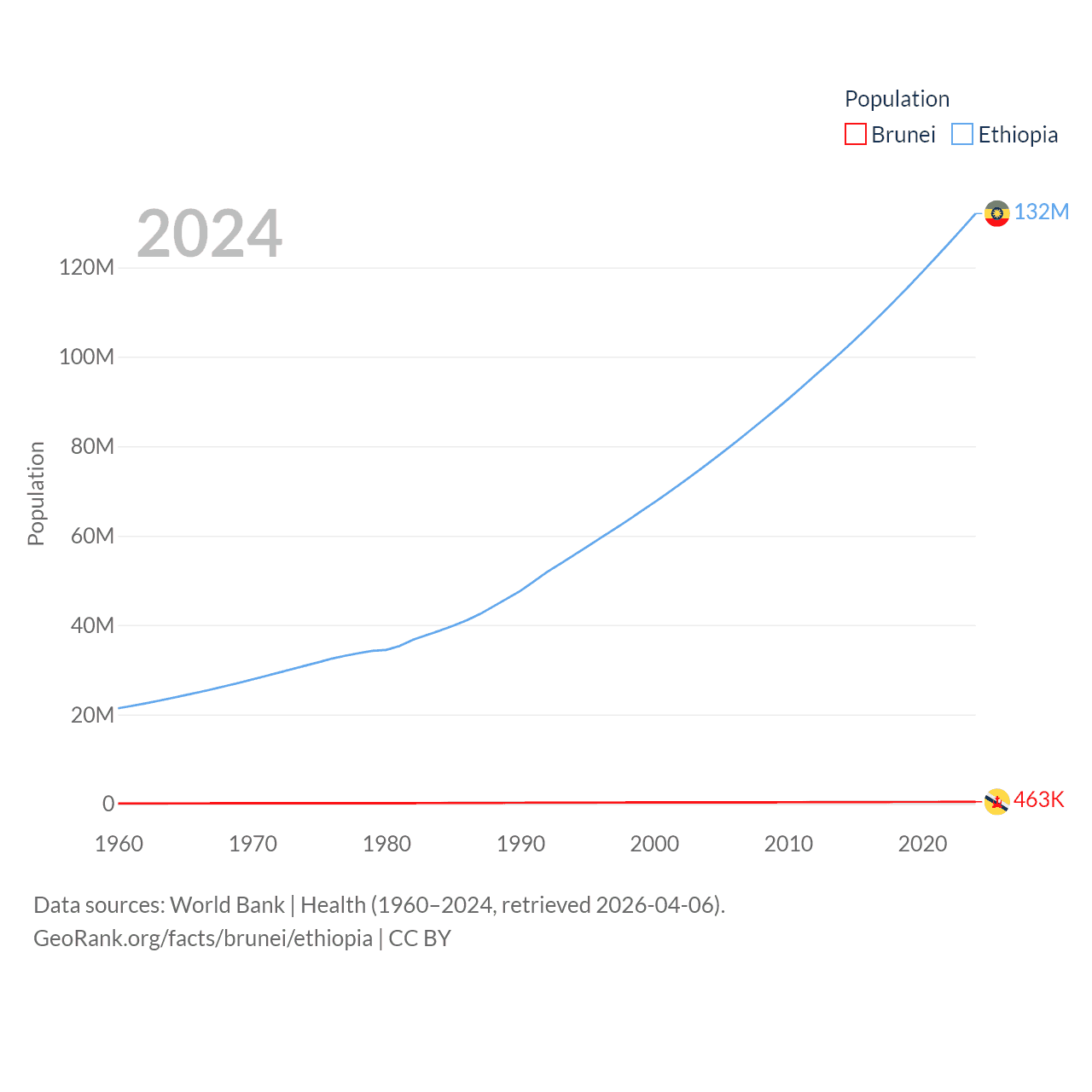 Brunei has a population of 463K (ranked 170/197), compared with 132M in Ethiopia (ranked 10/197). Brunei's land area is 2,035 sq mi versus 435,716 sq mi for Ethiopia (ranked 165th vs. 25th).