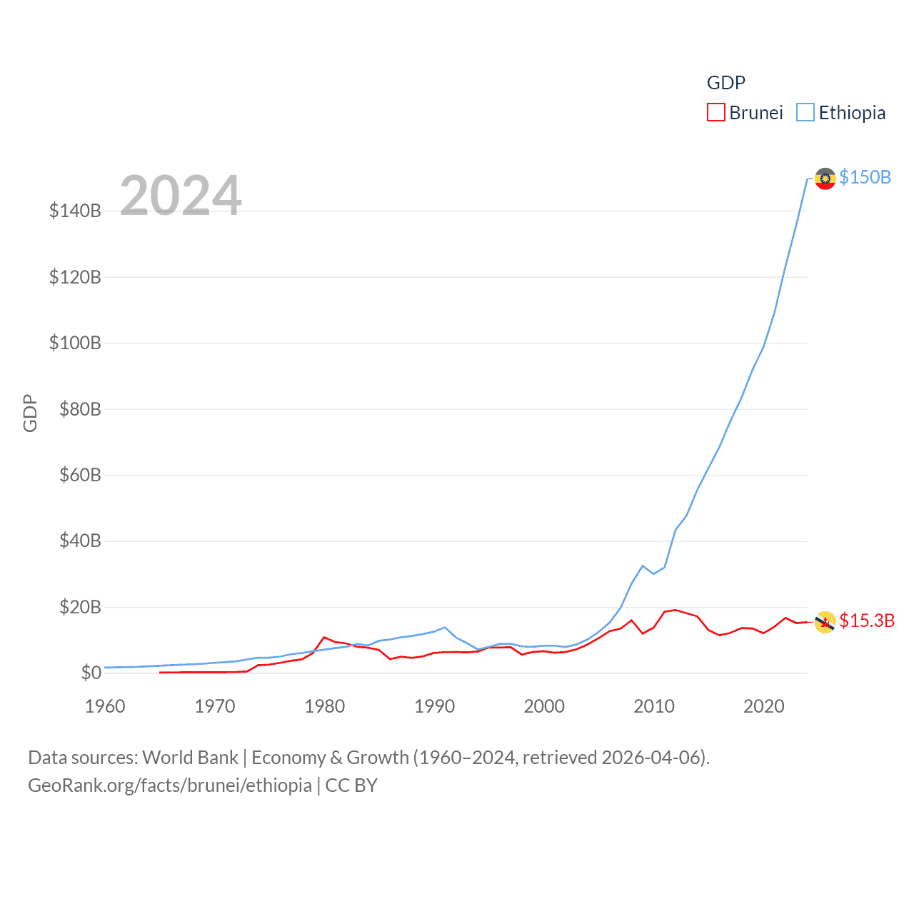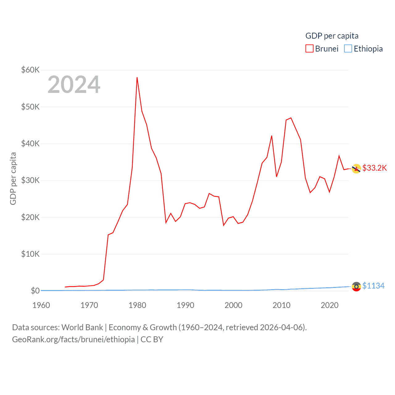 By GDP, Brunei ranks 142/197 ($15.3B) and Ethiopia ranks 60/197 ($150B). By GDP per capita, Brunei ranks 36/197 ($33,153), while Ethiopia ranks 171/197 ($1,134).