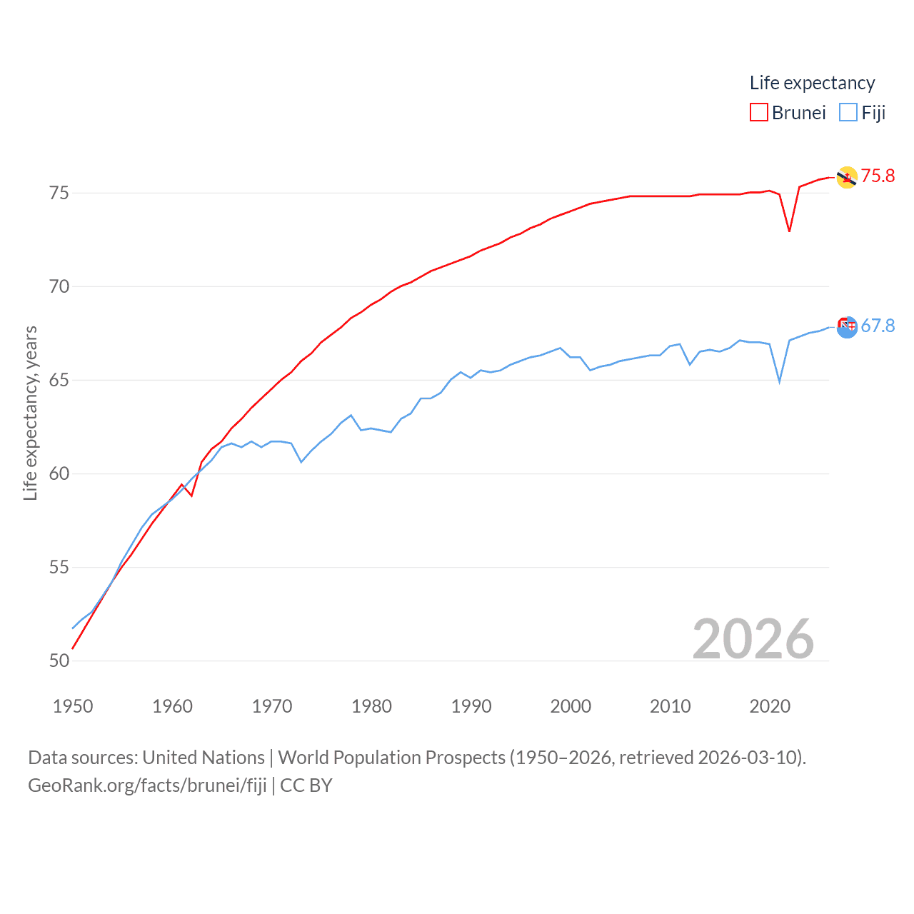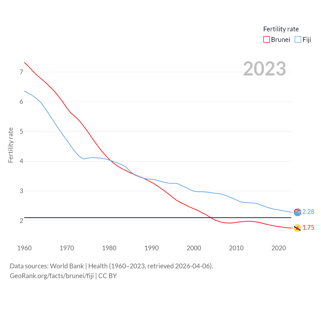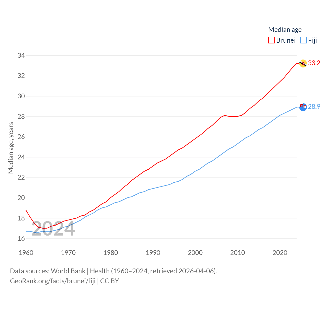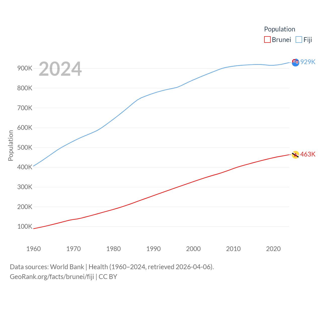 Brunei has a population of 463K (ranked 170/197), compared with 929K in Fiji (ranked 159/197). Brunei's land area is 2,035 sq mi versus 7,054 sq mi for Fiji (ranked 165th vs. 152nd).